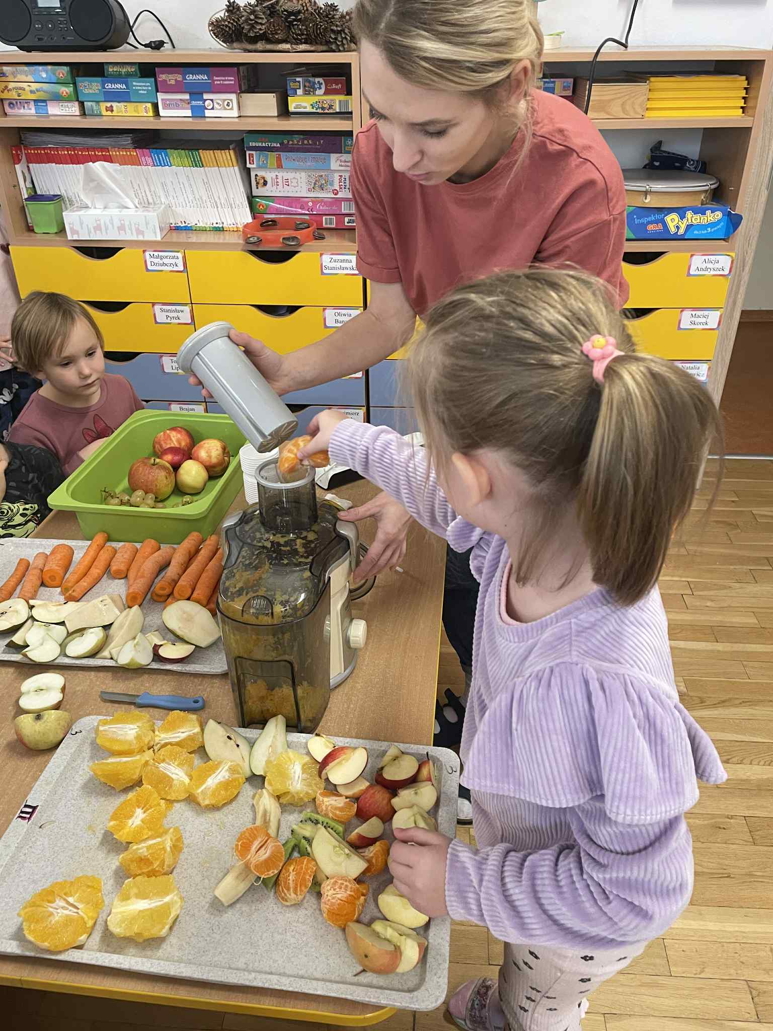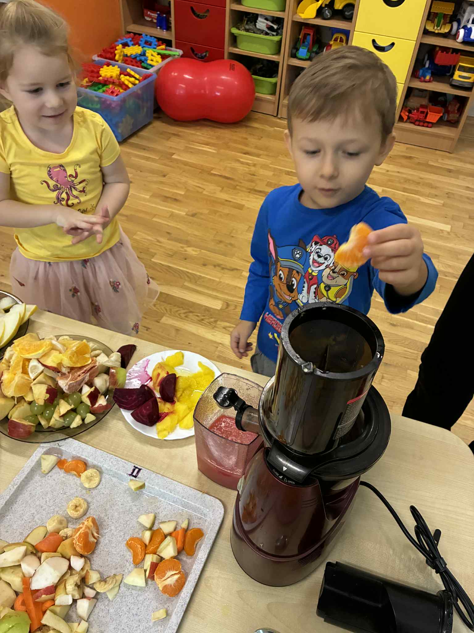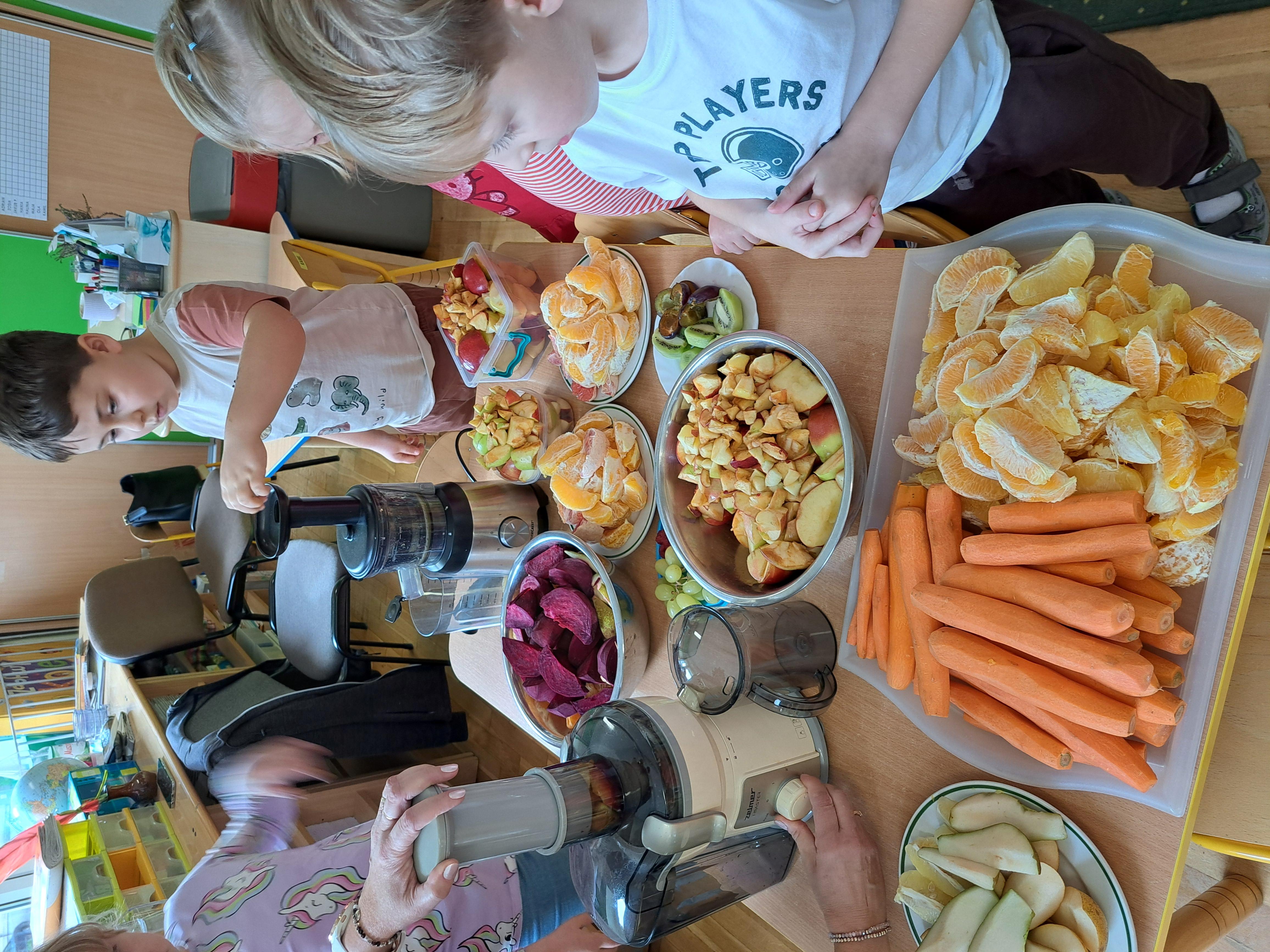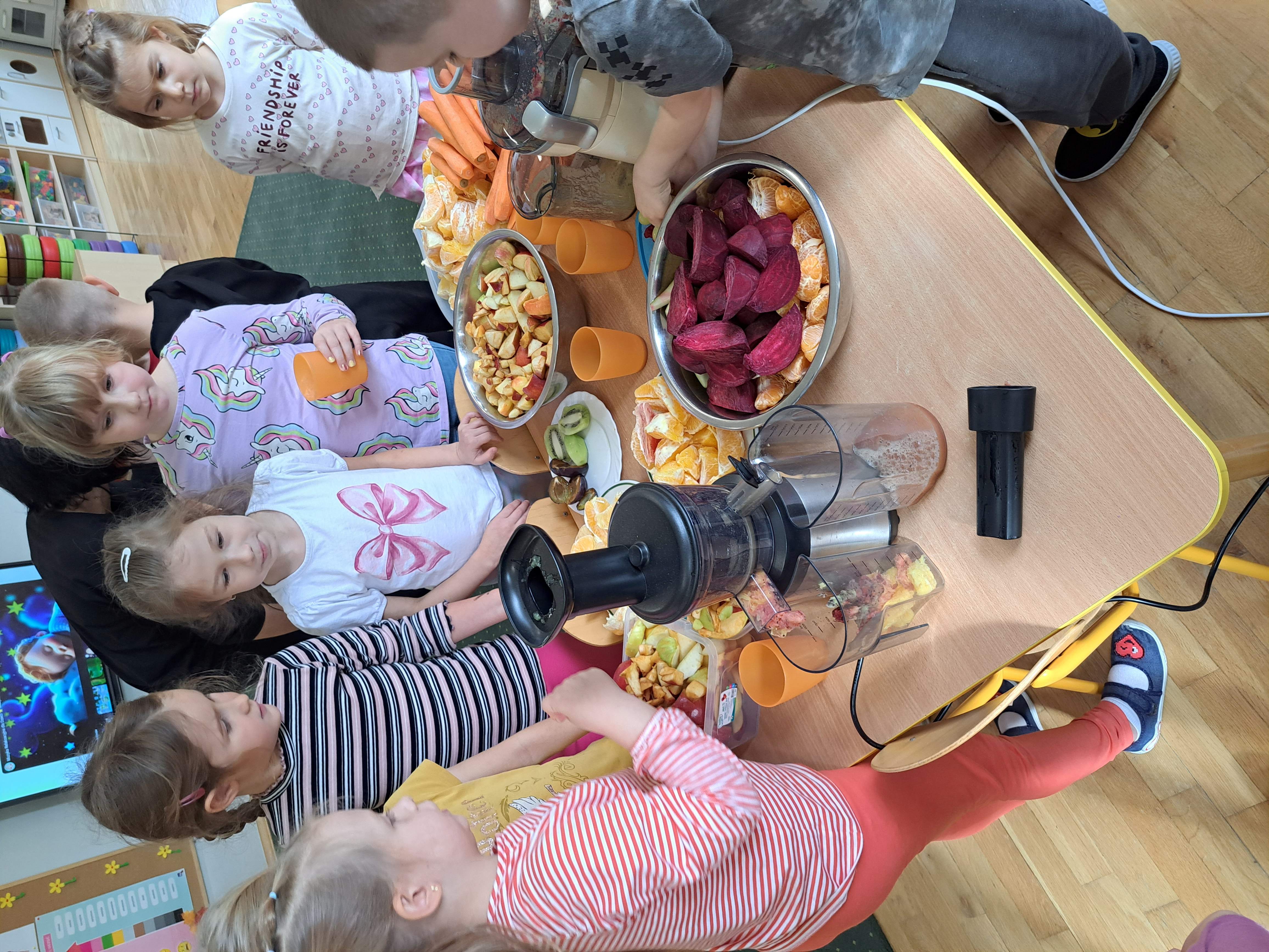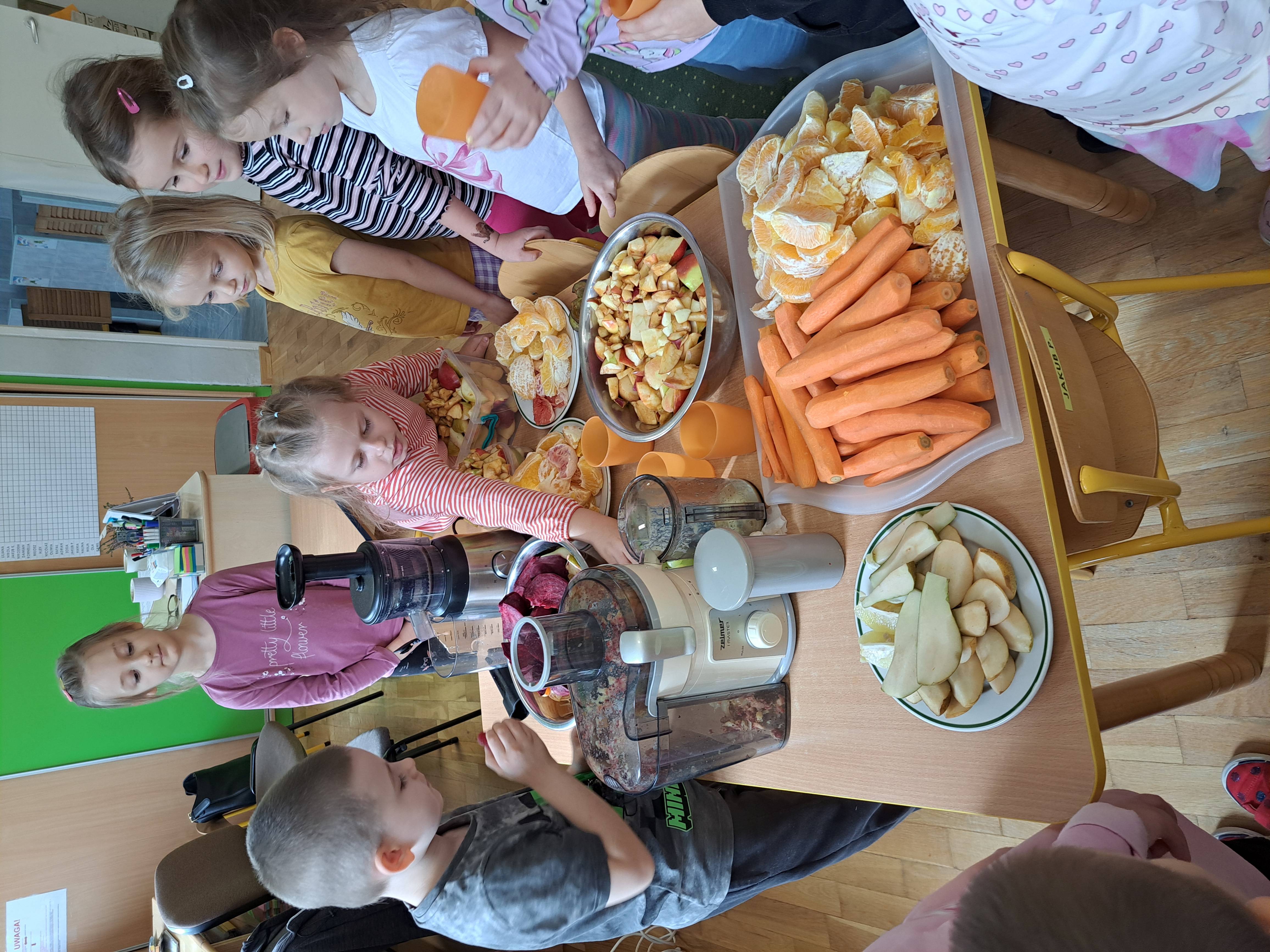 Dzieci samodzielnie kroiły owoce i wkładały do wyciskarki, próbując każdego smaku. Było pysznie!