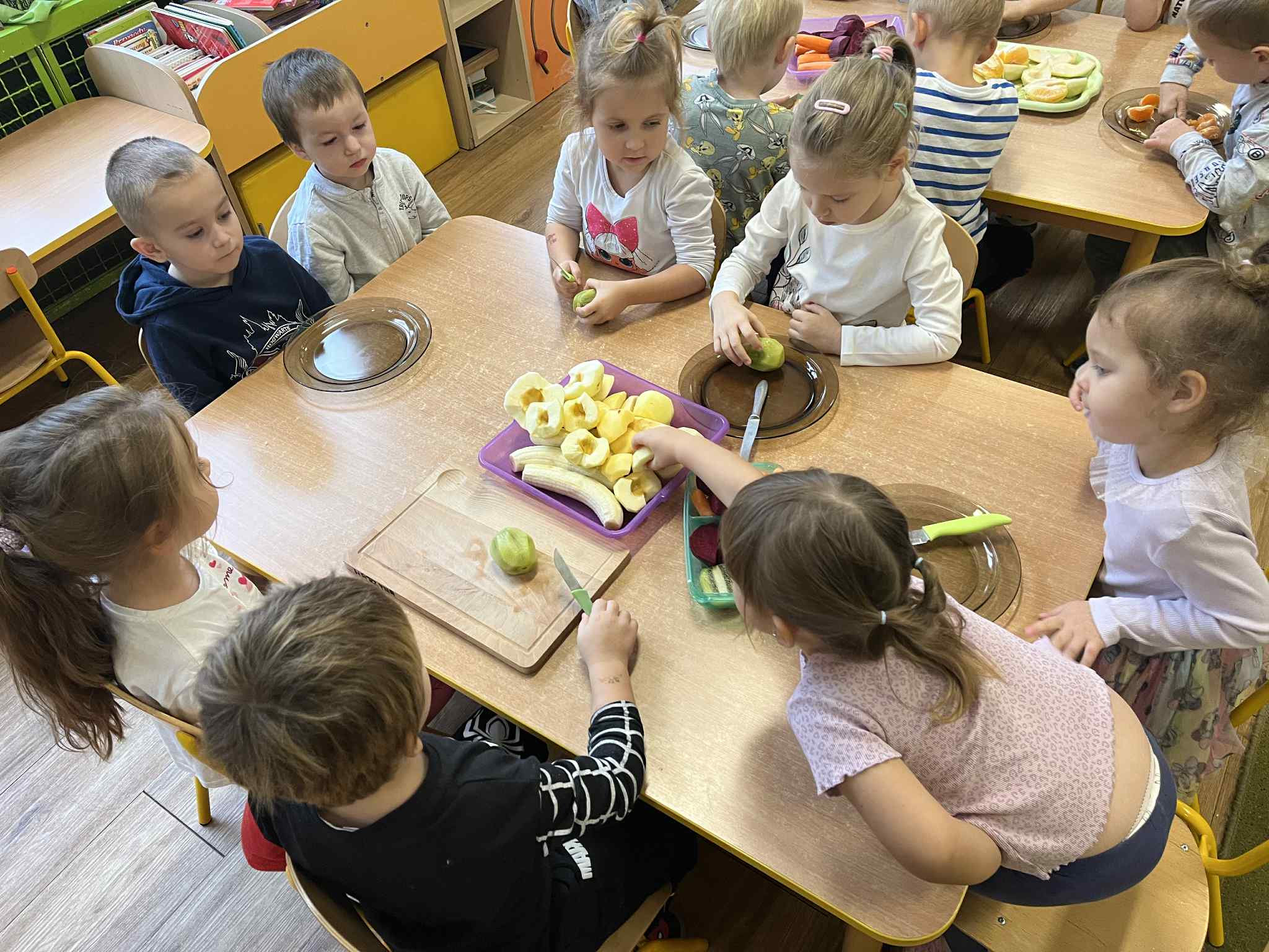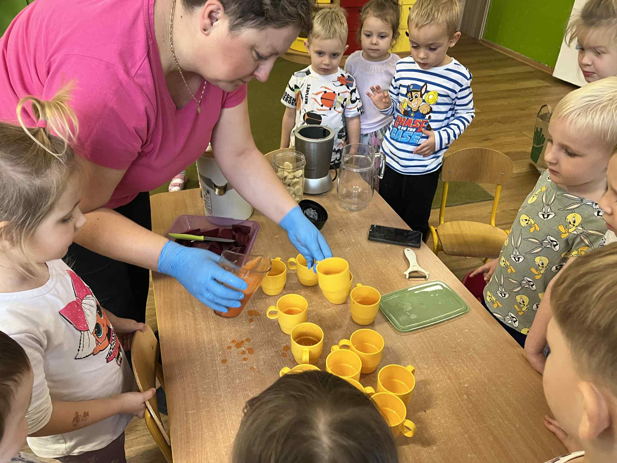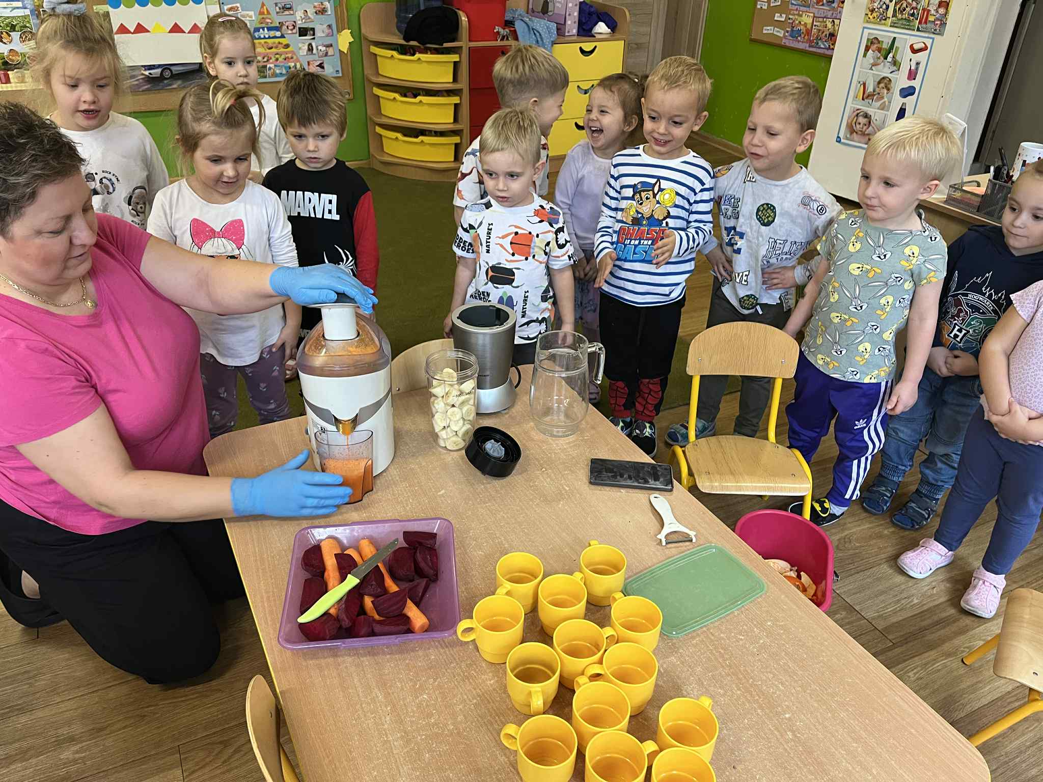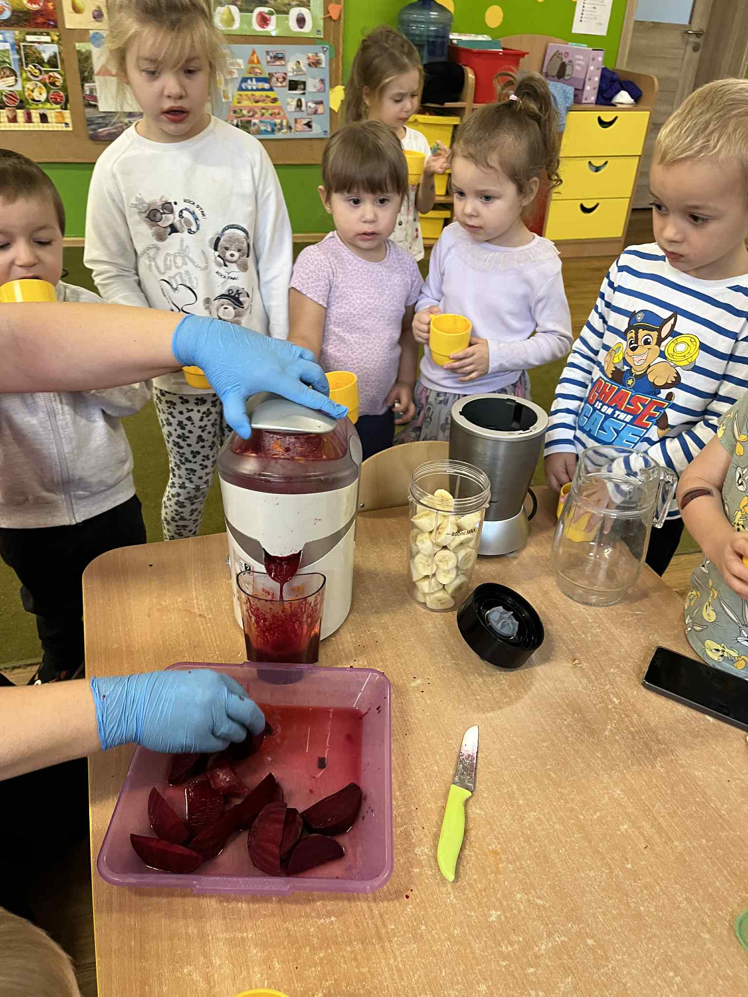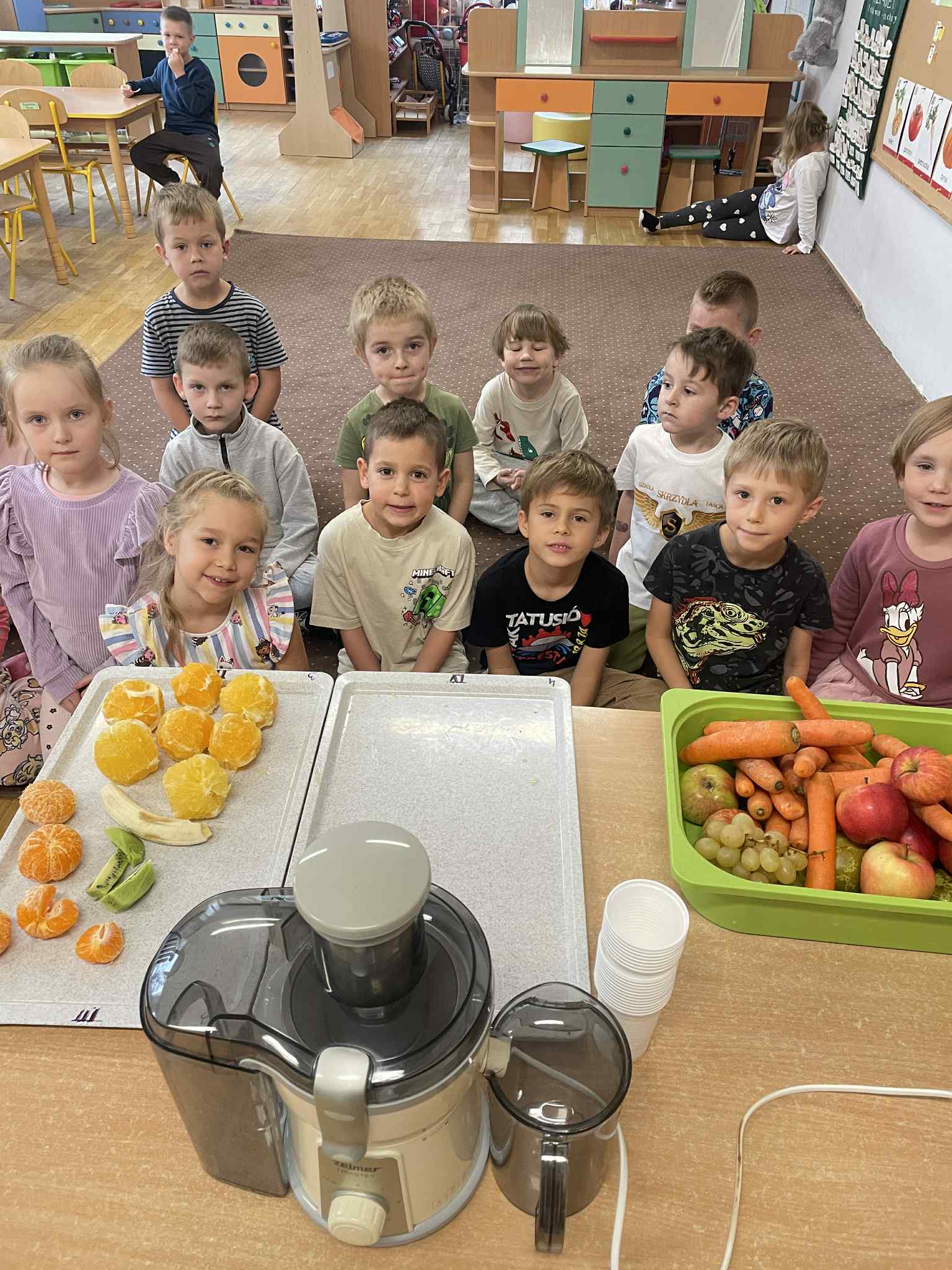 Dzieci samodzielnie kroiły owoce i wkładały do wyciskarki, próbując każdego smaku. Było pysznie!
