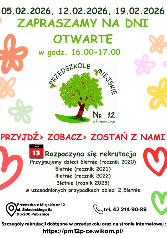Zapraszamy na dni otwarte w naszym przedszkolu. Prosimy o przekazywanie informacji dalej i zachęcanie innych do odwiedzenia naszego przedszkola w podanych terminach.