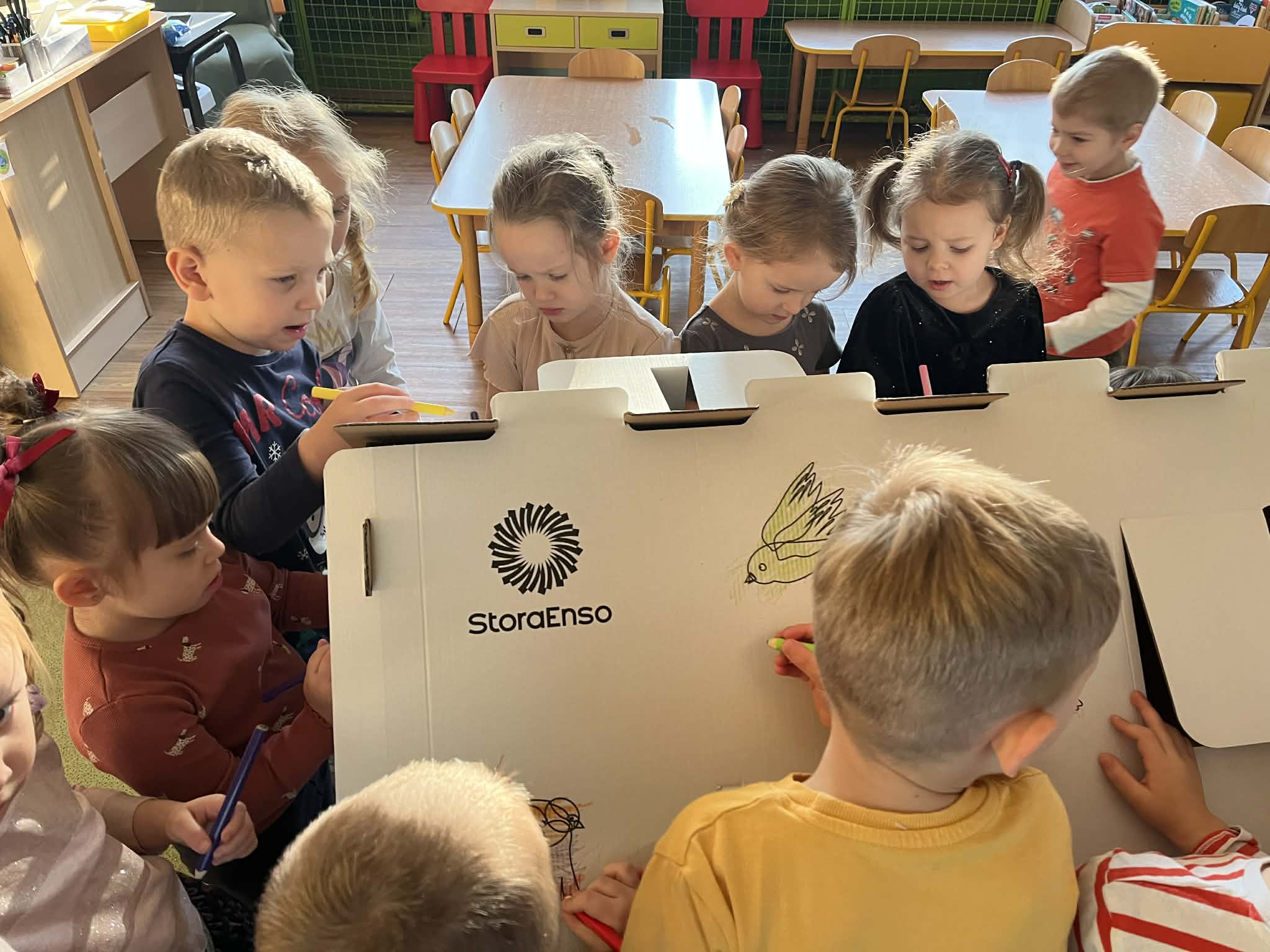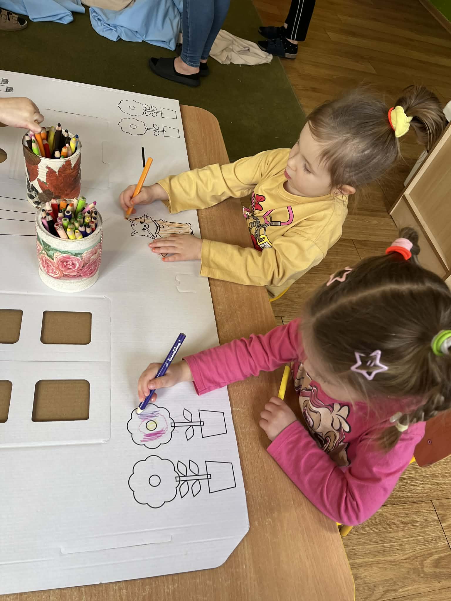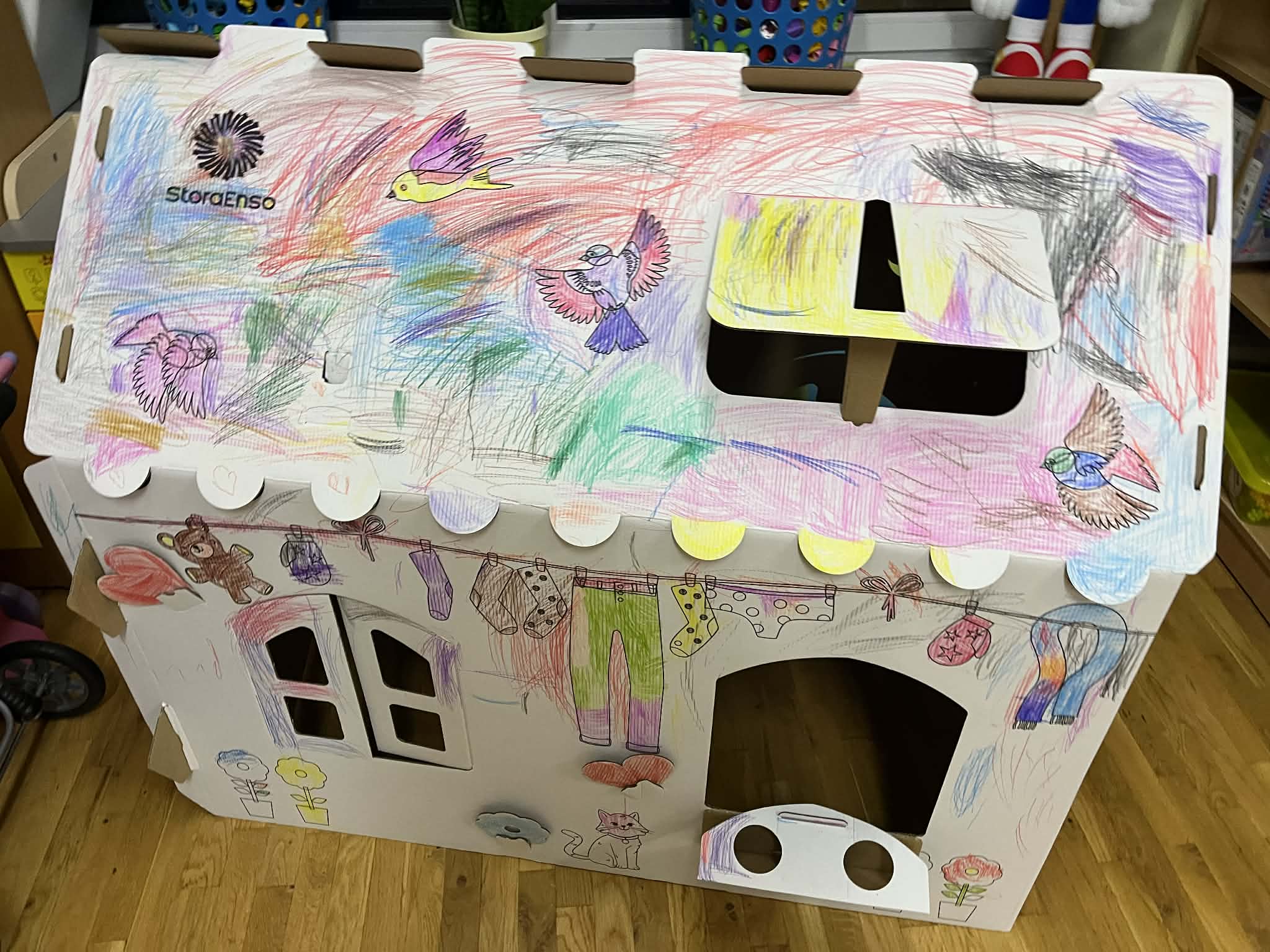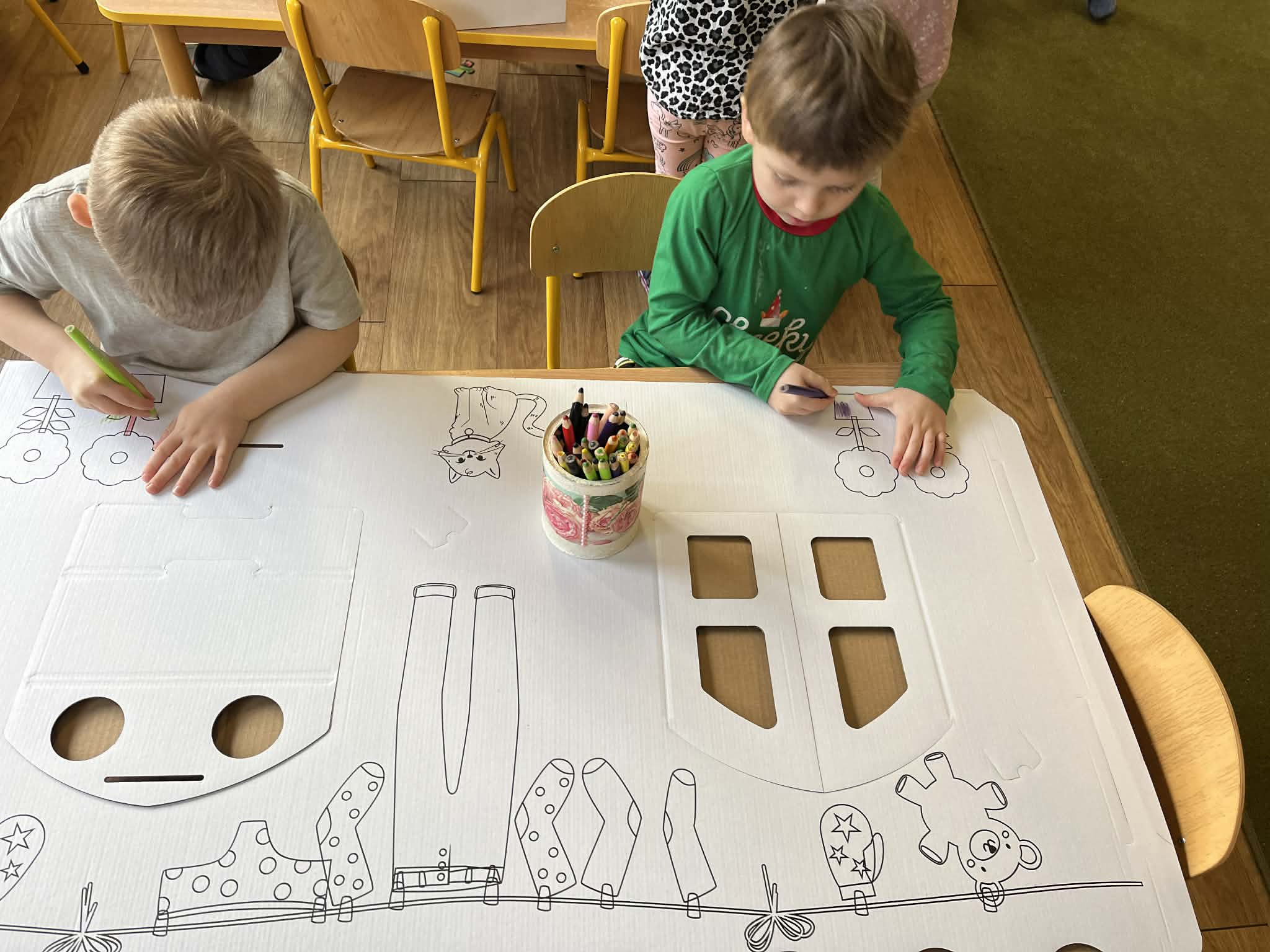 Każda grupa przedszkolna otrzymała tekturowy domek do pokolorowania oraz złożenia.