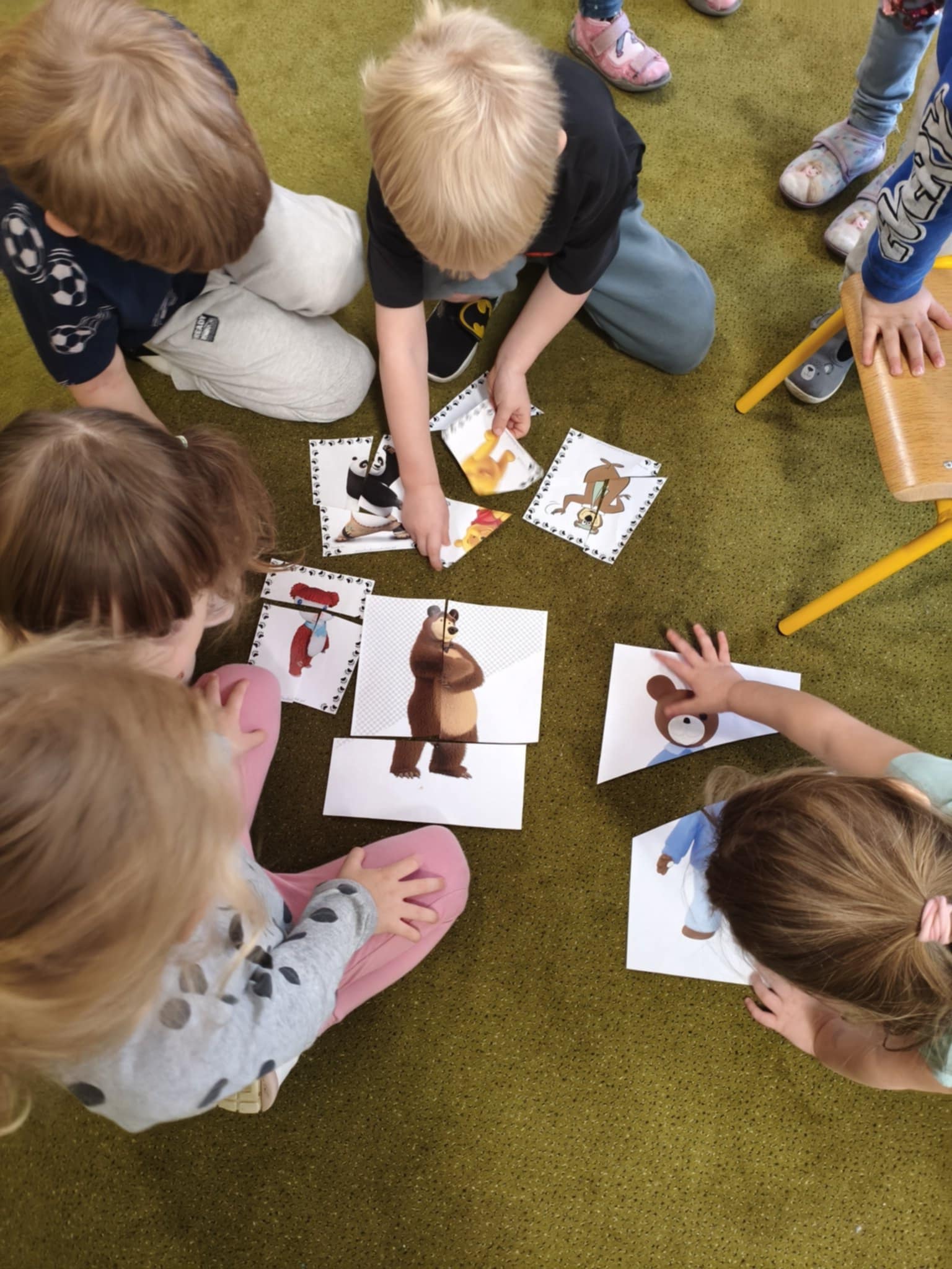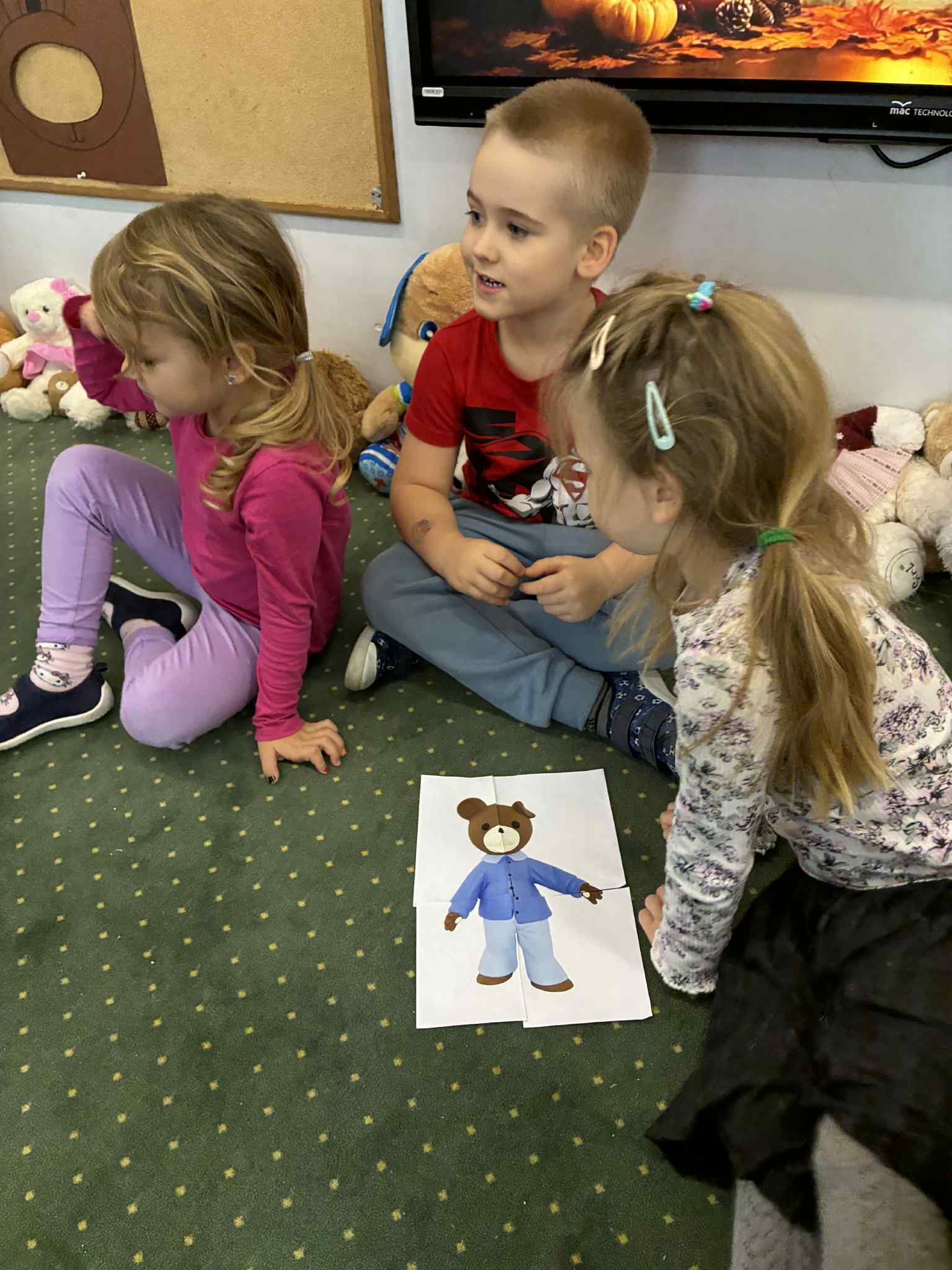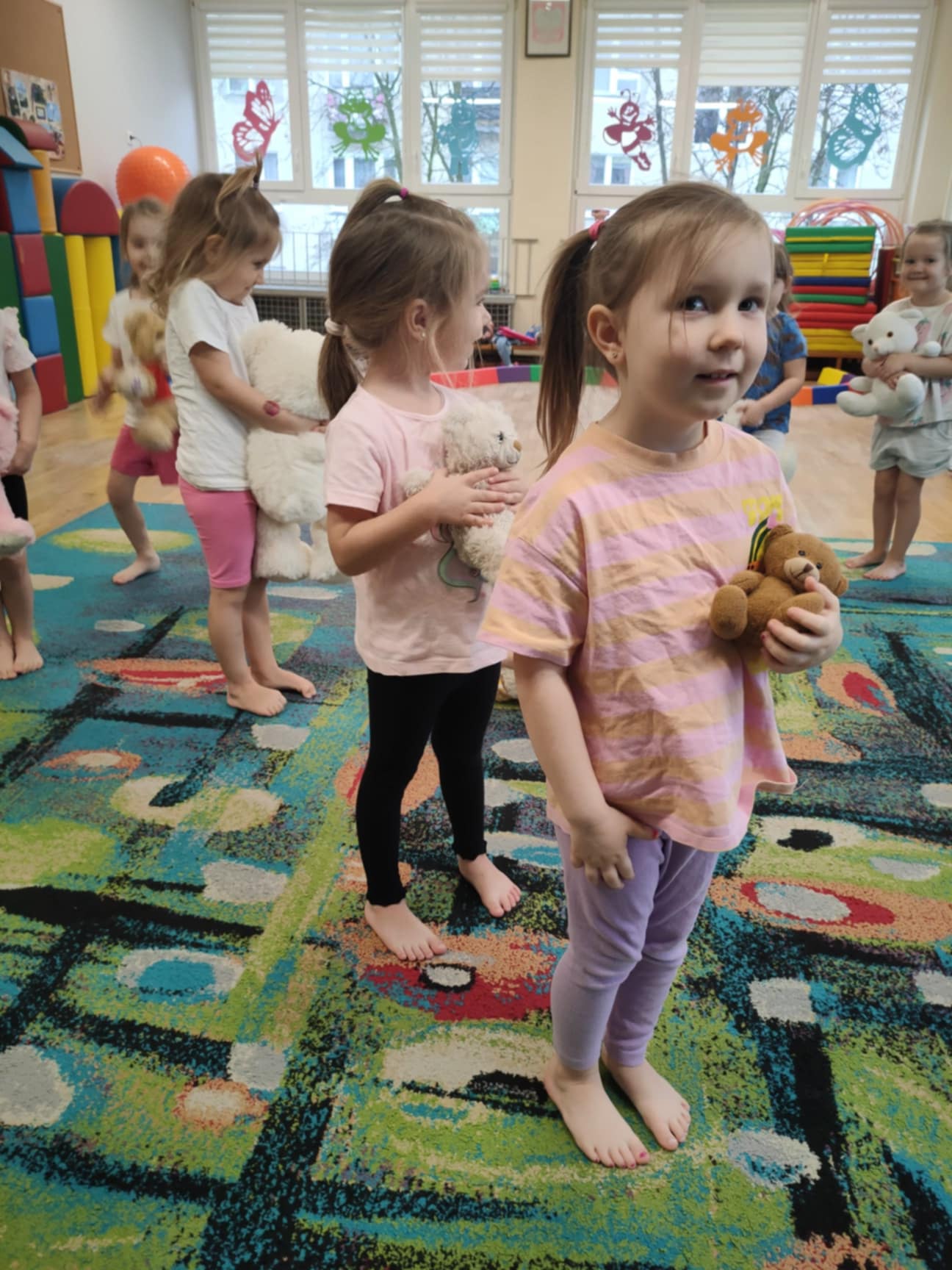 Podczas zajęć przedszkolaki z zaangażowaniem układały puzzle z wizerunkami misiów, ćwicząc spostrzegawczość i współpracę. Nauczyły się prostej zabawy o samotnym misiu, który szukał przyjaciół, "karmiły" misia podczas rzucania woreczkami/piłeczkami.