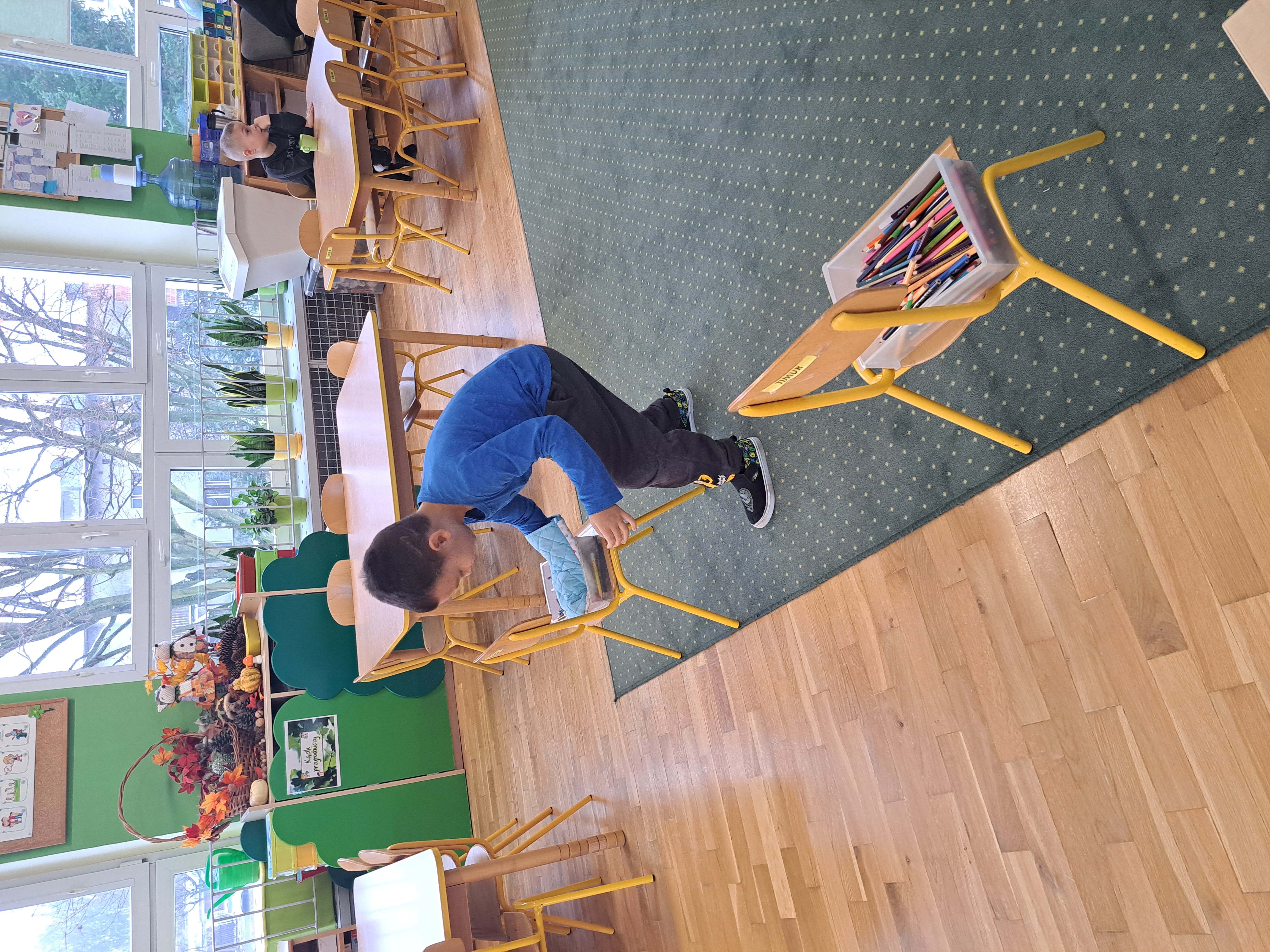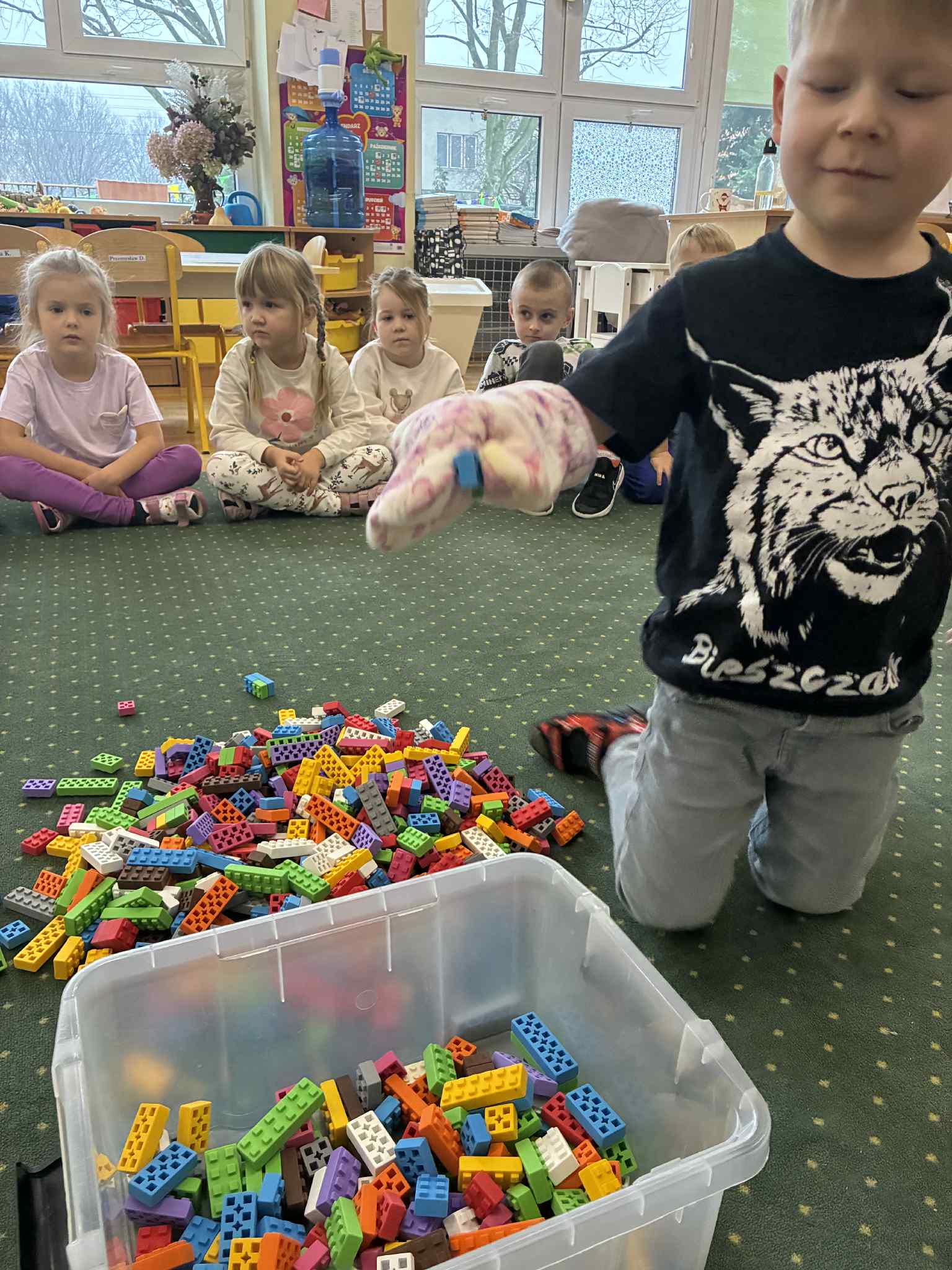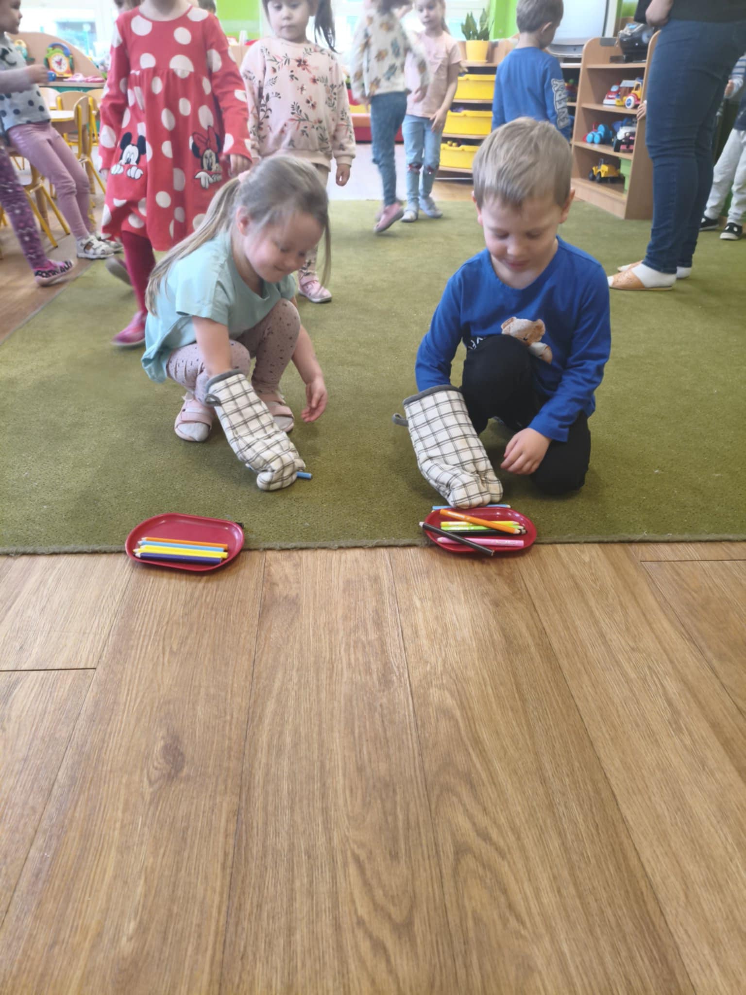 Nie zabrakło też ruchowych aktywności – dzieci próbowały zbierać kredki przy pomocy kuchennej rękawicy ("misiowe łapy"), co okazało się świetną zabawą i doskonałym ćwiczeniem motoryki małej.