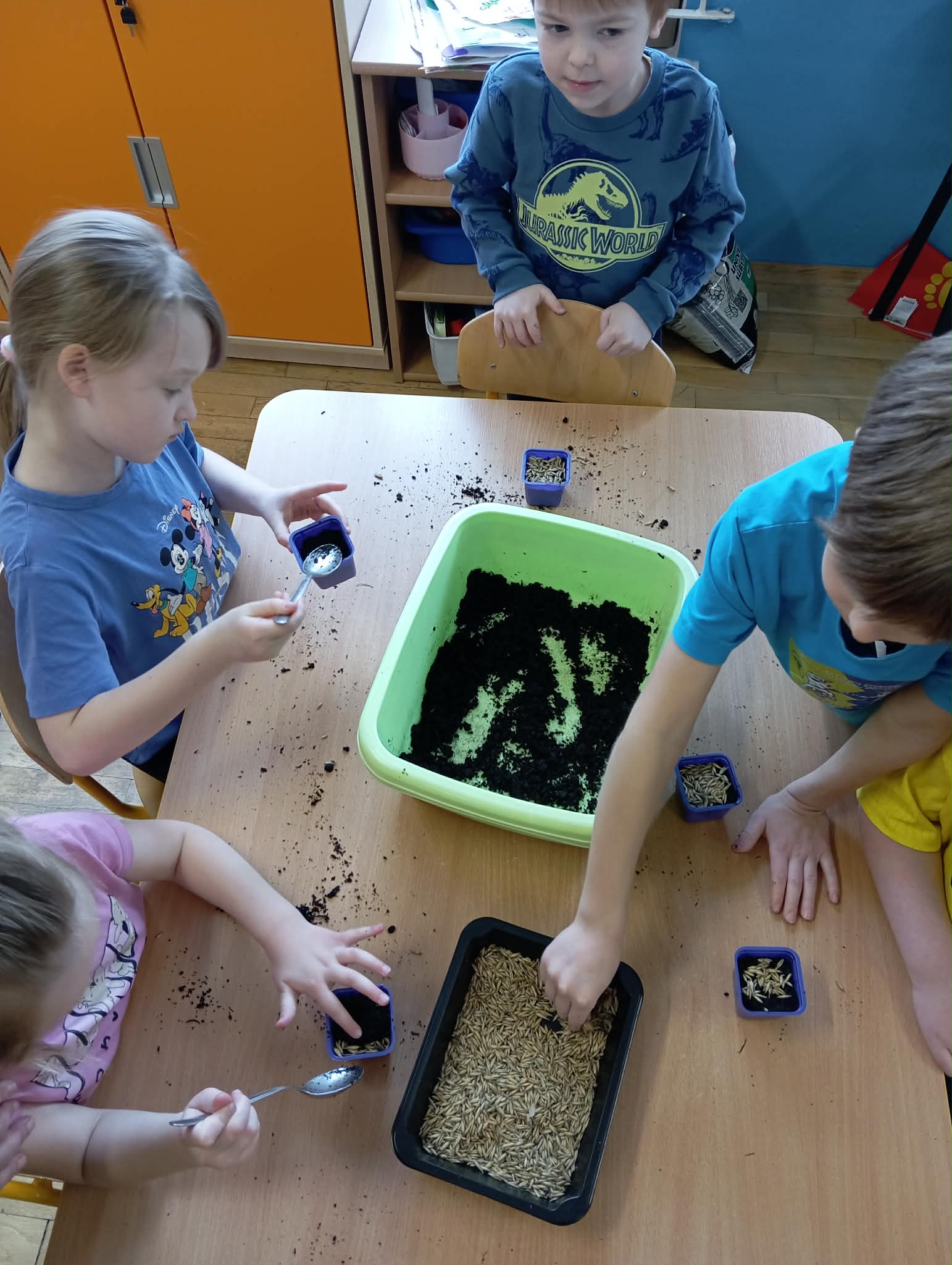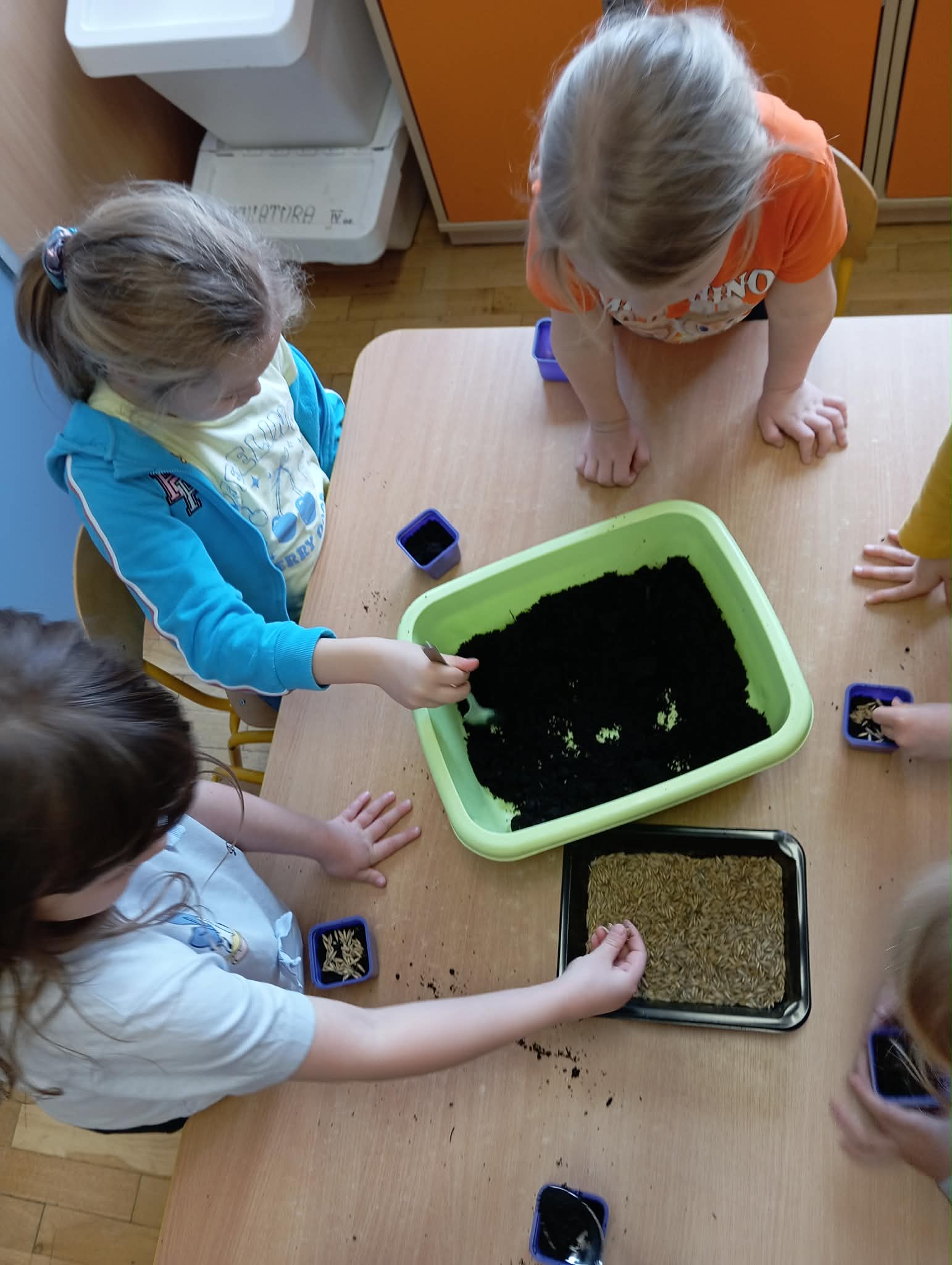 Sadzenie owsa i rzeżuchy wprowadziło dzieci w świat ekologii i pozwoliło im cieszyć się efektami własnej pracy. Z niecierpliwością czekamy na pierwsze zielone pędy, które będą ozdobą naszych przedszkolnych okien i stołów.