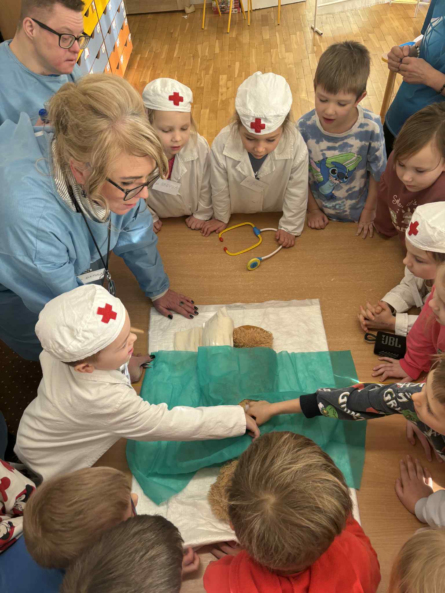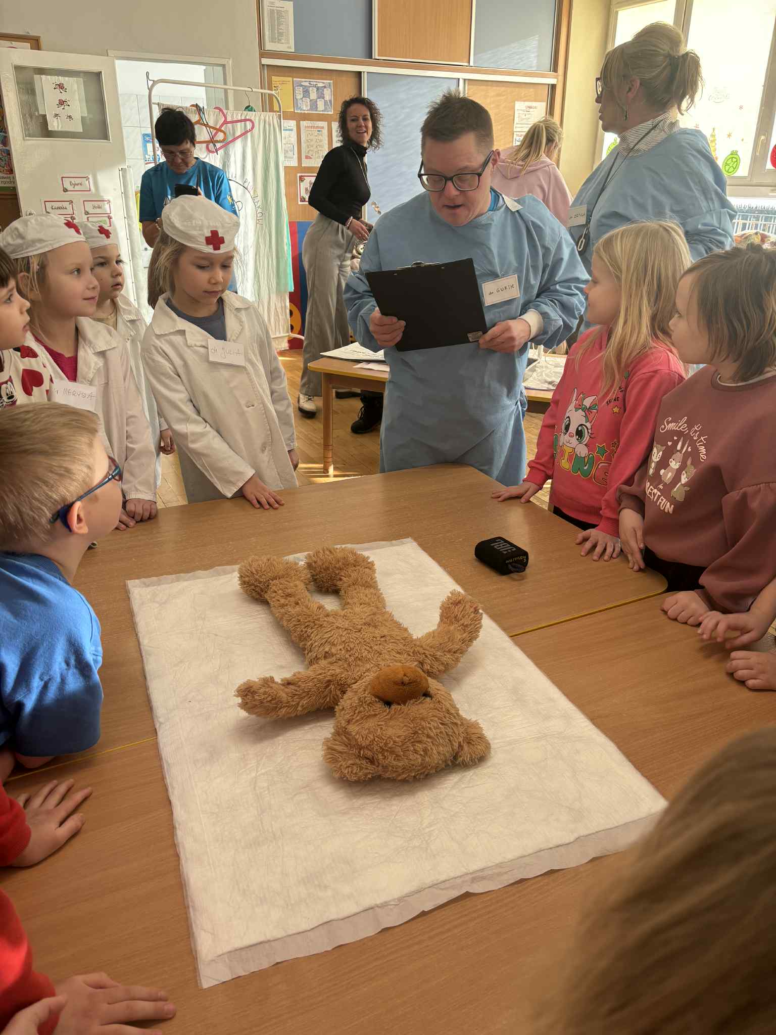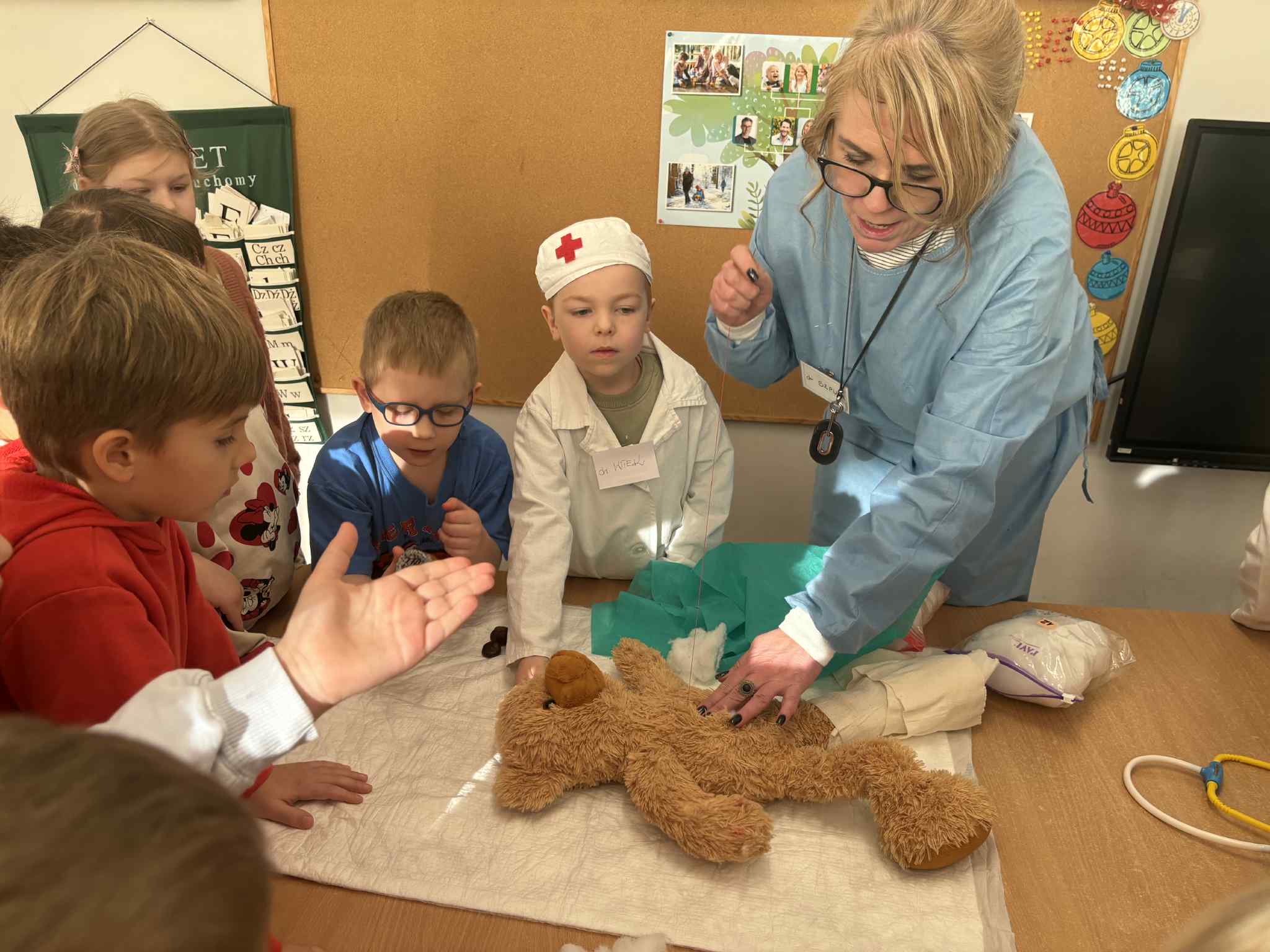 Wspólnie z dziećmi z grupy IV podopieczni WTZ "leczyły pluszaki". Przedszkolaki wzięły udział w operacji misia pod czujnym okiem Dr Szpuli.