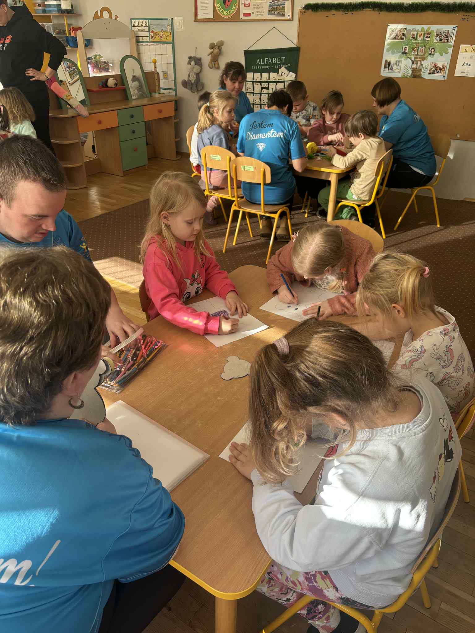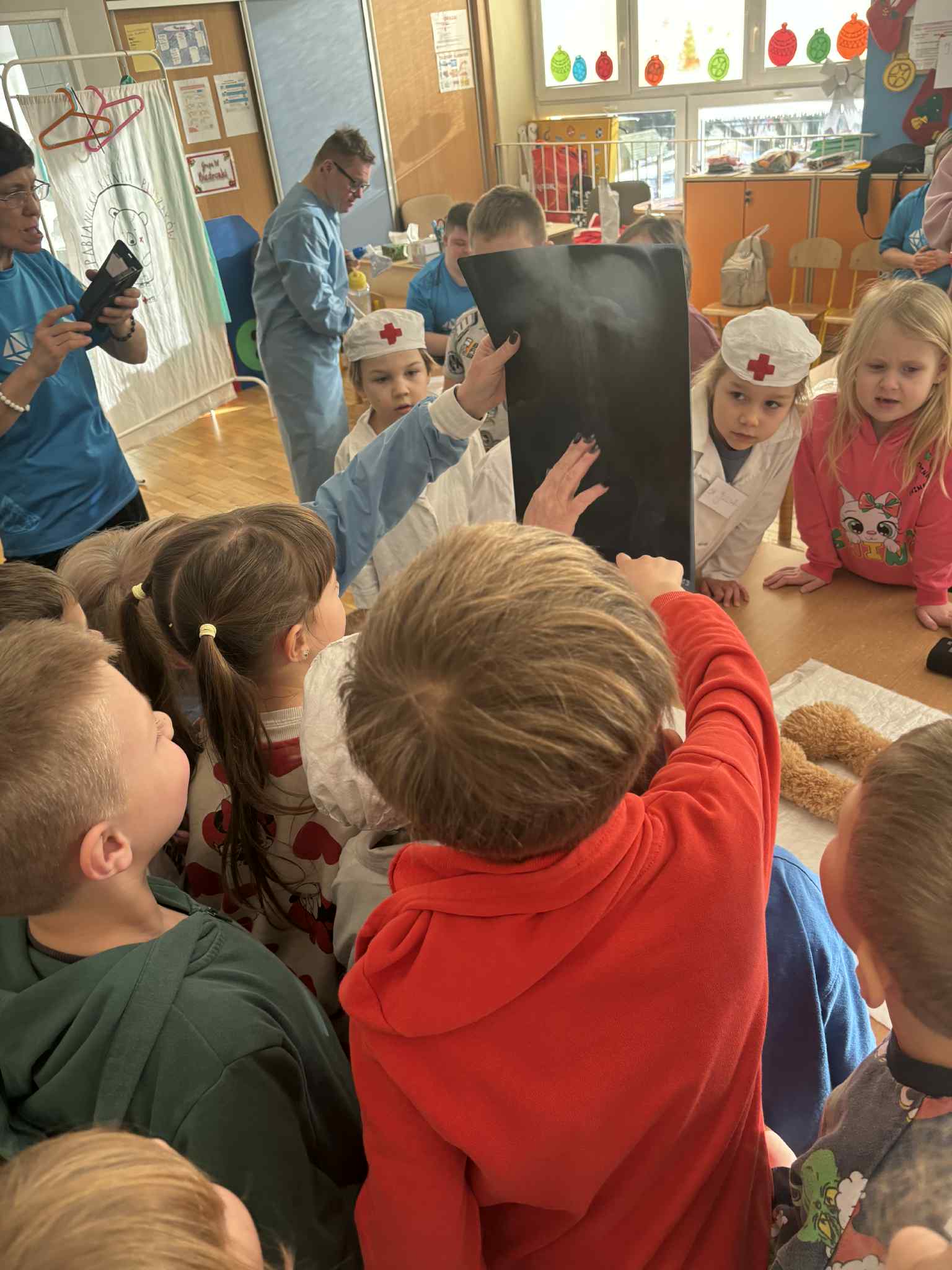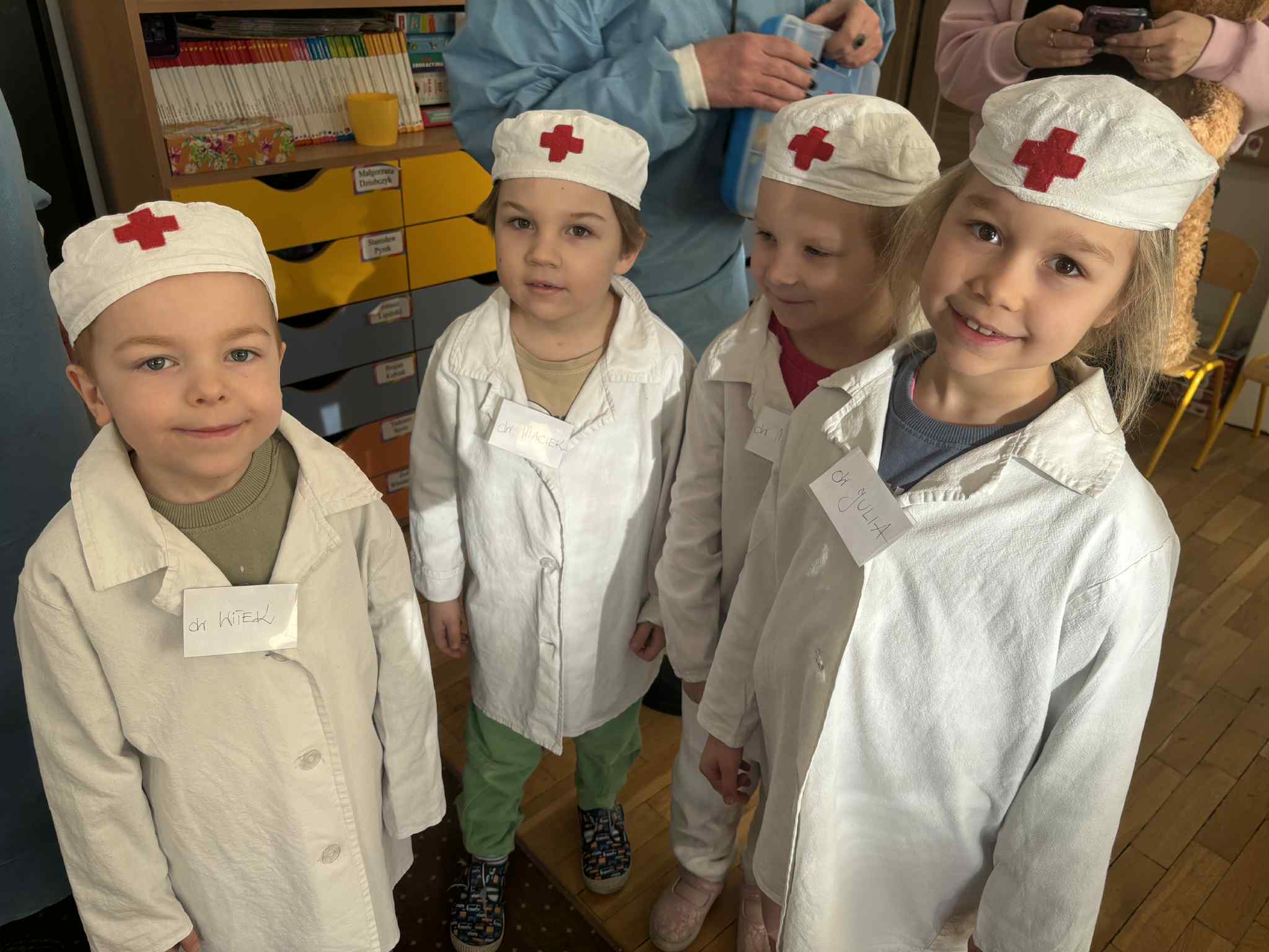 Wspólnie z dziećmi z grupy IV podopieczni WTZ "leczyły pluszaki". Przedszkolaki wzięły udział w operacji misia pod czujnym okiem Dr Szpuli.