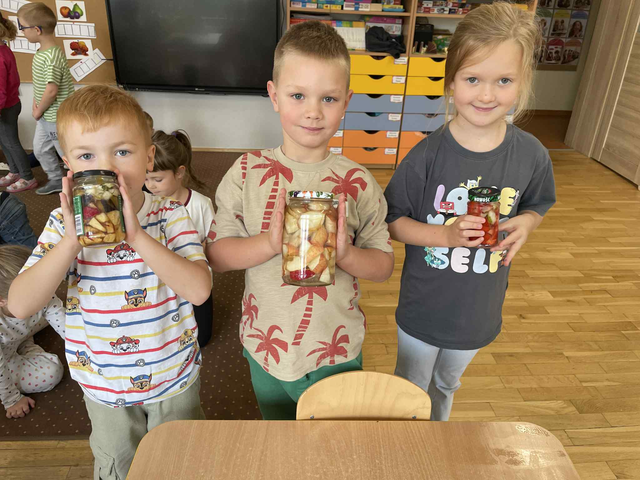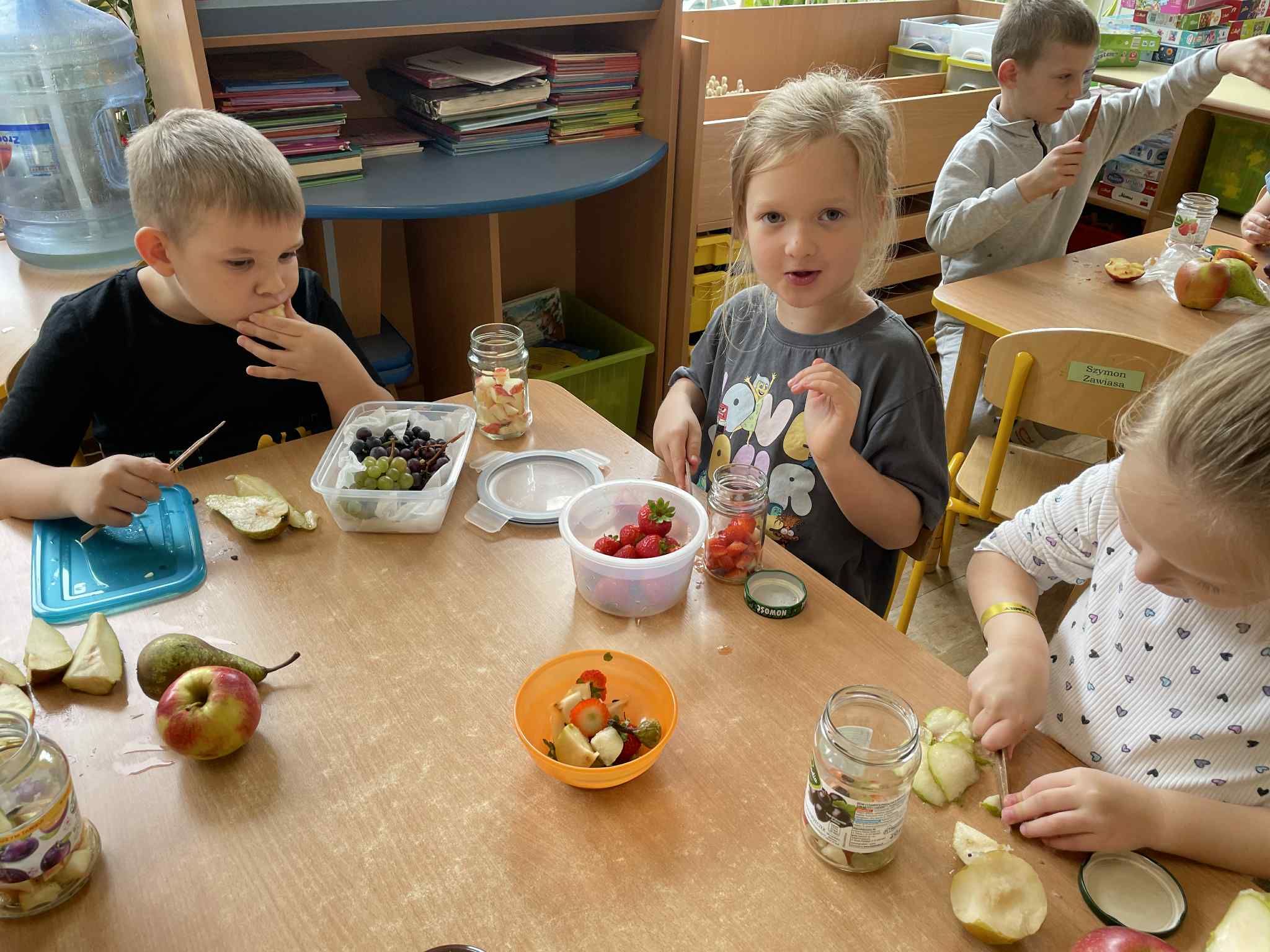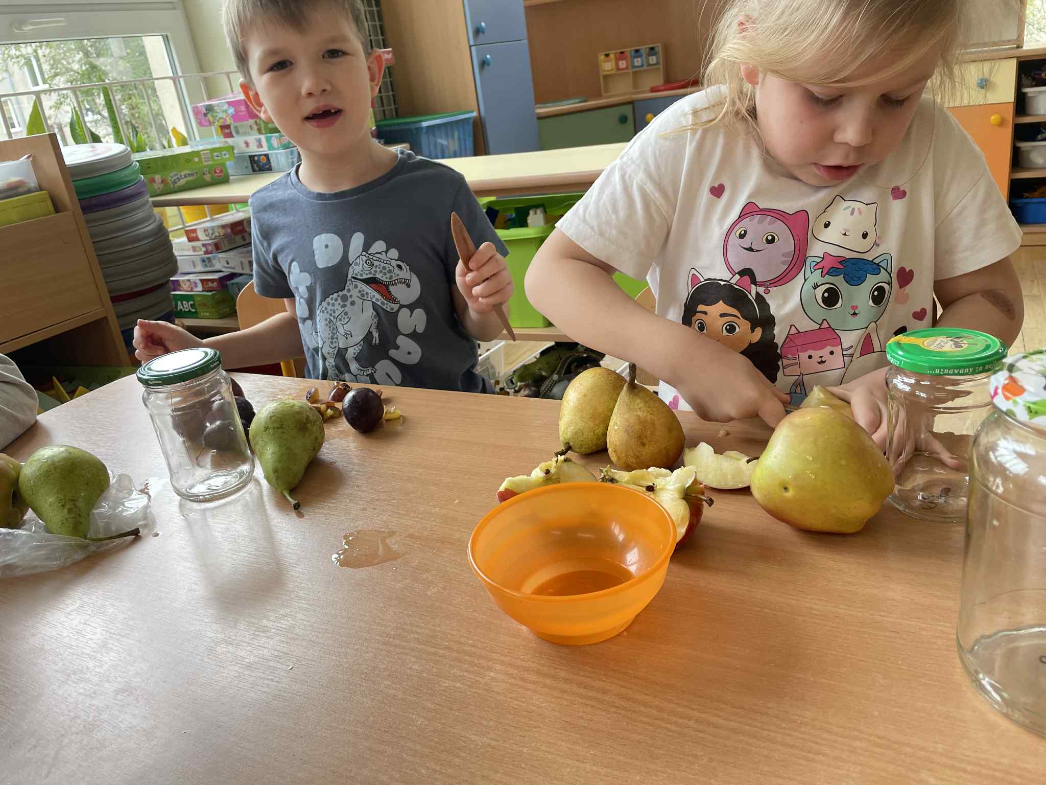 Dzieci przyniosły z domu różnorodne owoce – jabłka, gruszki, śliwki, truskawki i winogrona. Dzieci umyły owoce, pokroiły, a następnie napełniły nimi słoiki. Każdy słoik został zasypany cukrem i zalany wodą.