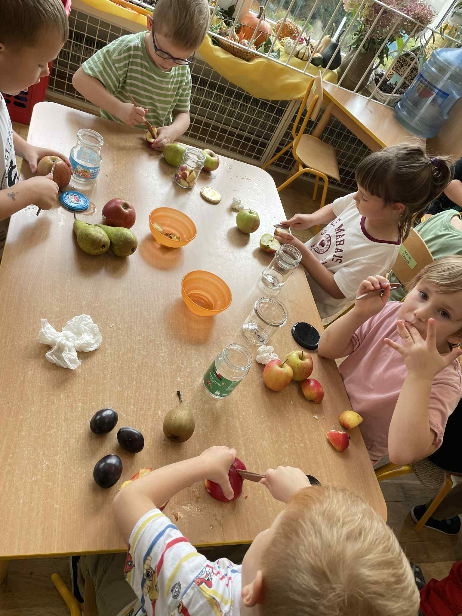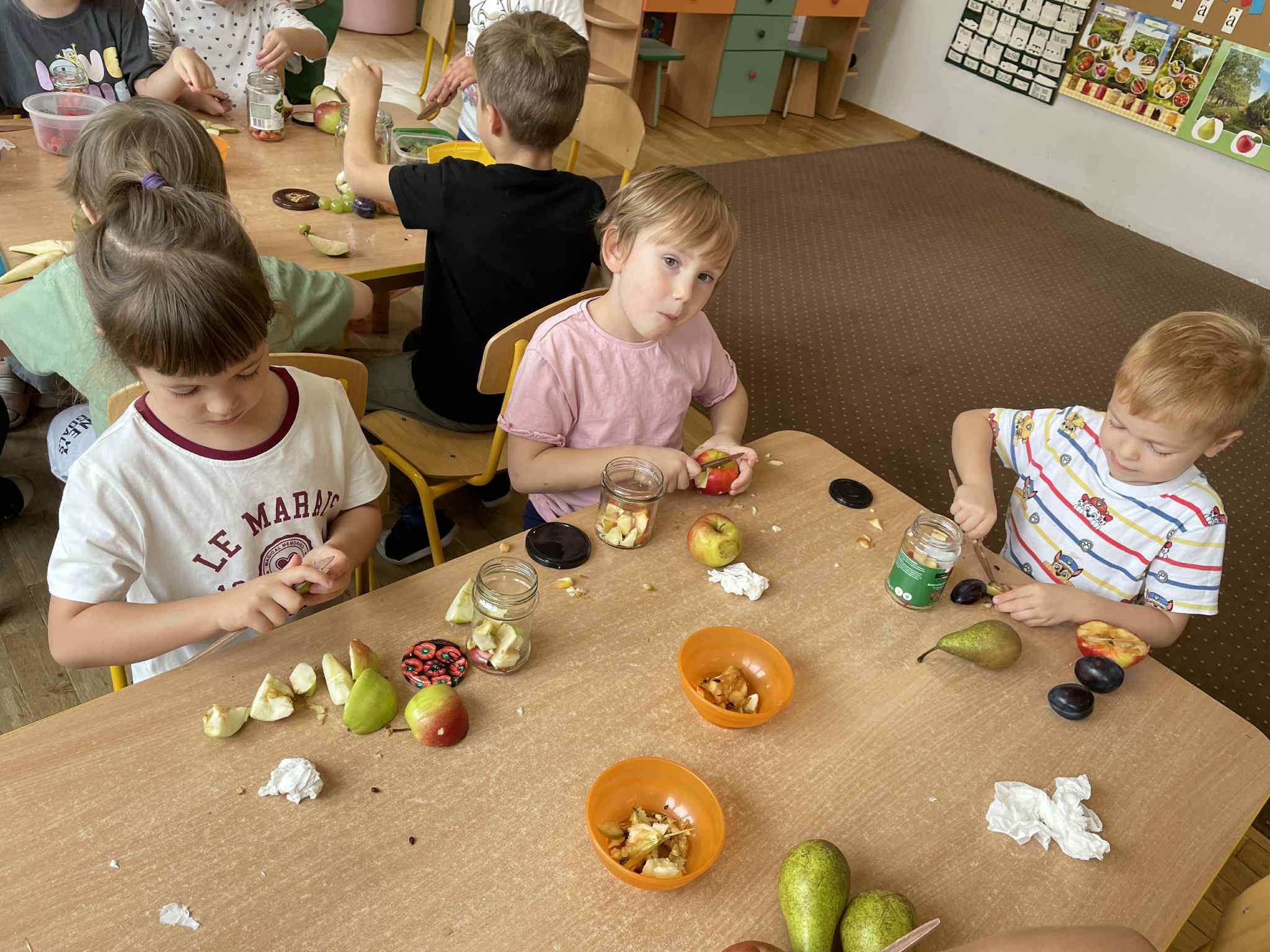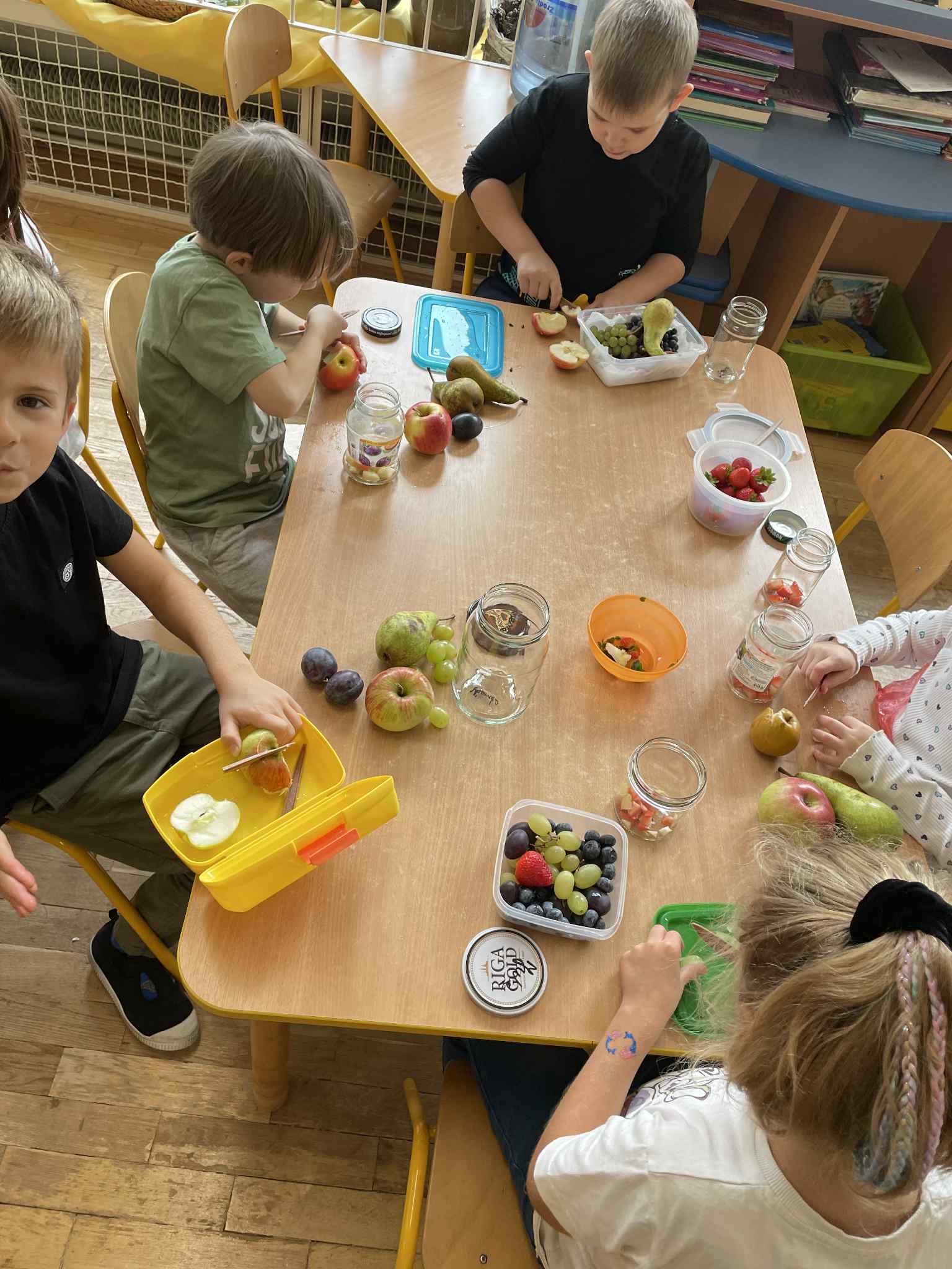 Dzieci przyniosły z domu różnorodne owoce – jabłka, gruszki, śliwki, truskawki i winogrona. Dzieci umyły owoce, pokroiły, a następnie napełniły nimi słoiki. Każdy słoik został zasypany cukrem i zalany wodą.