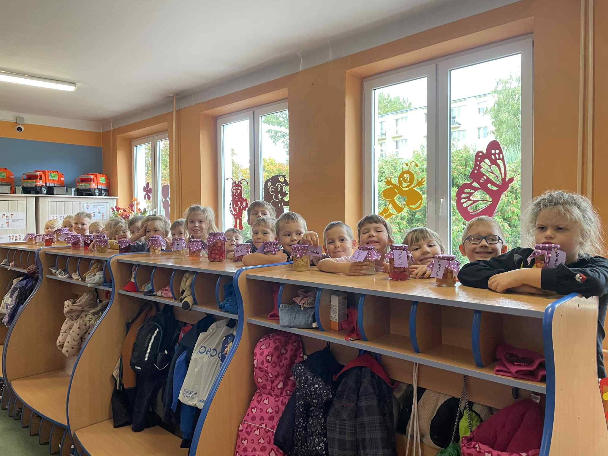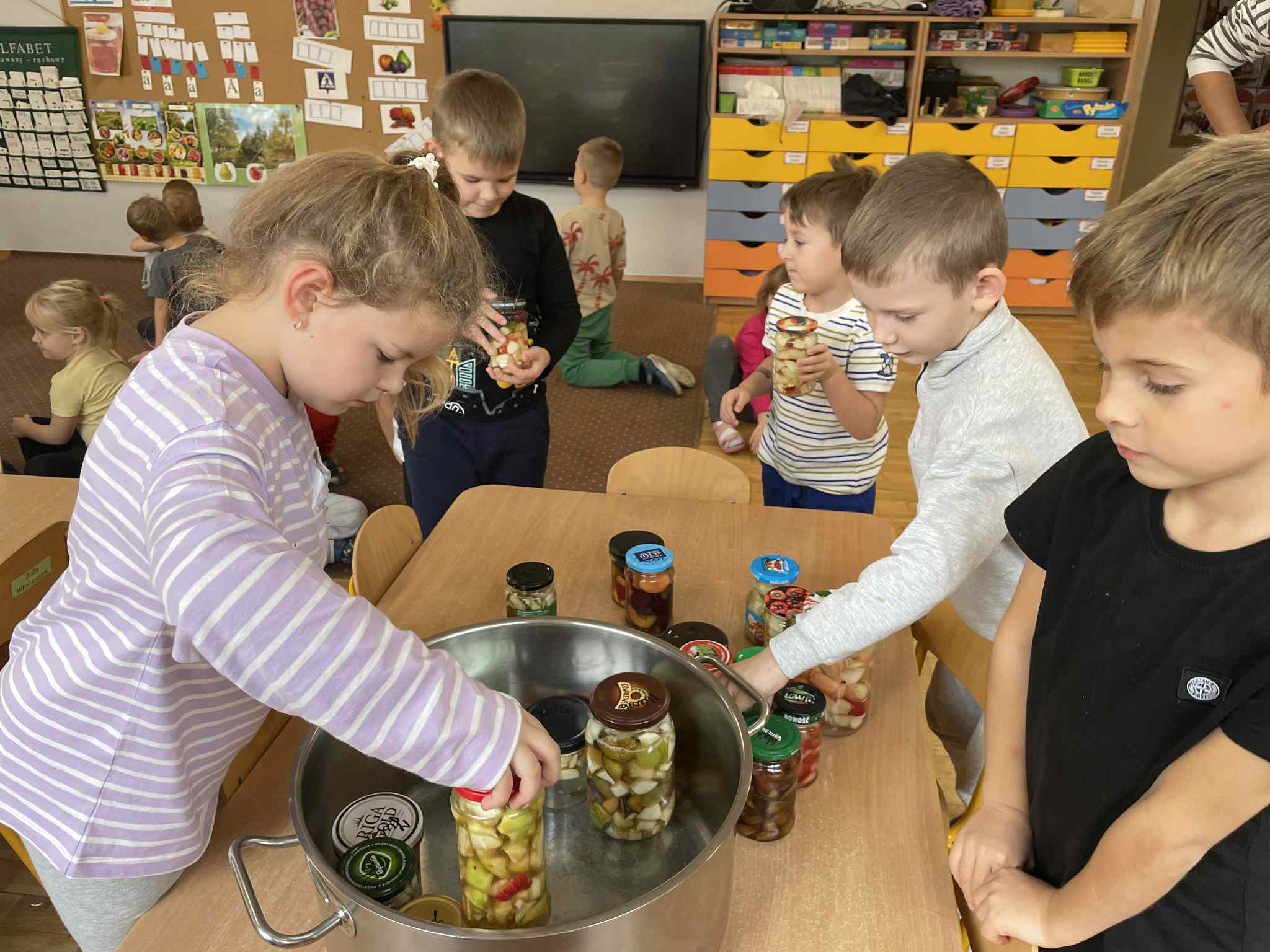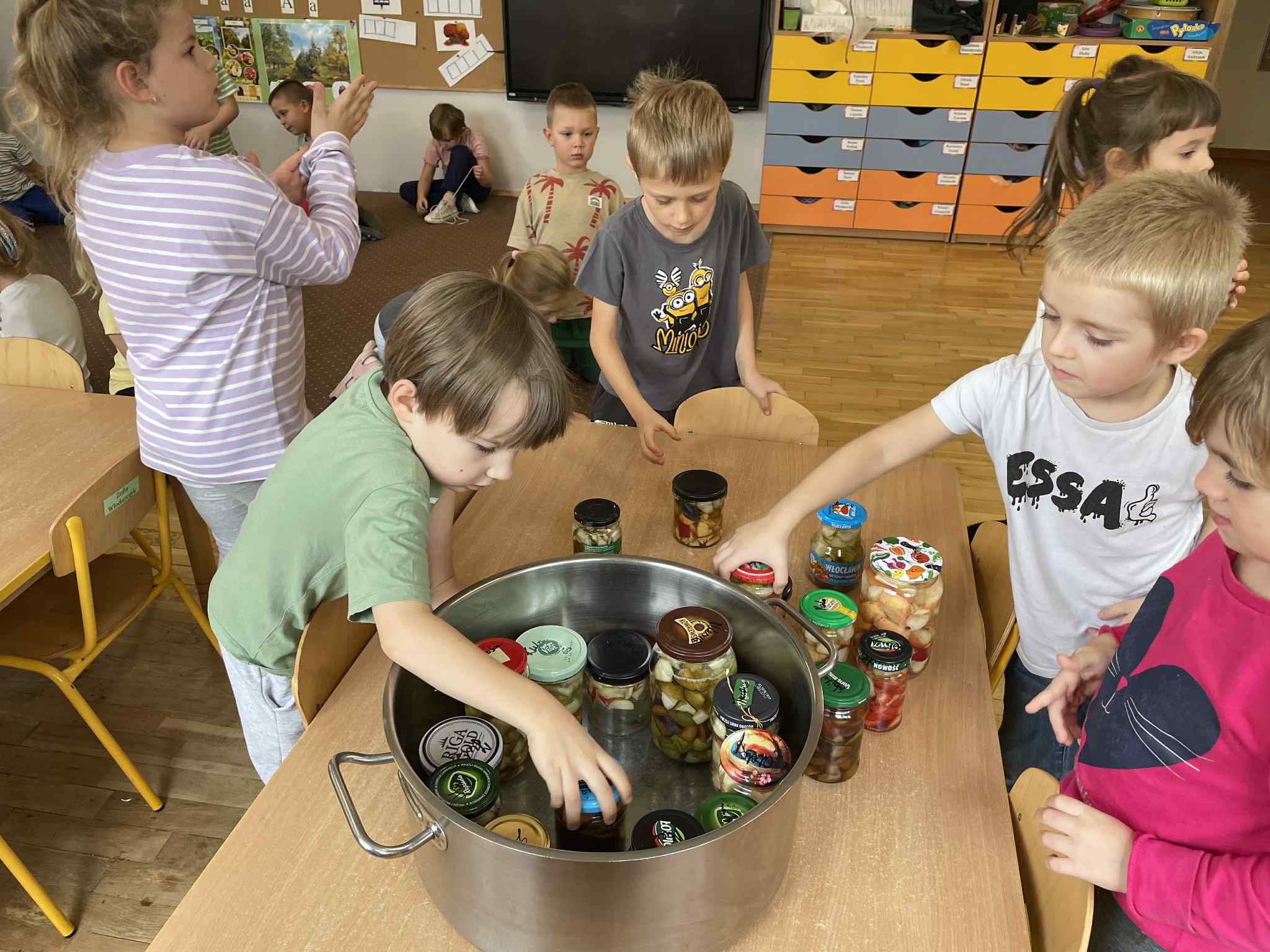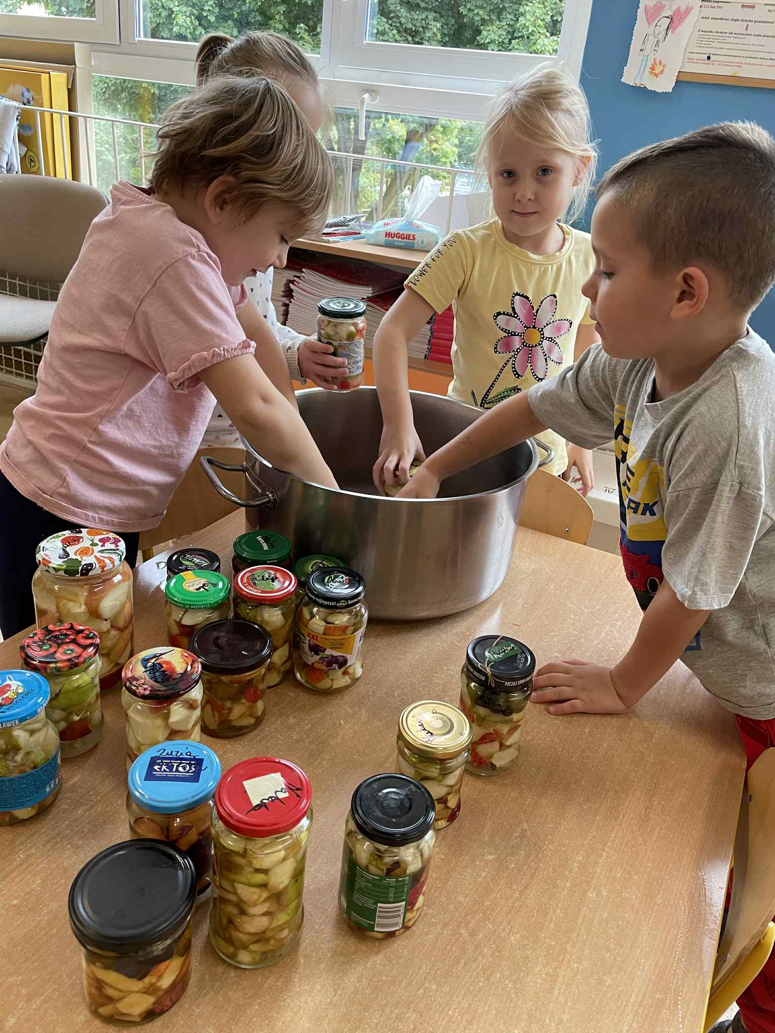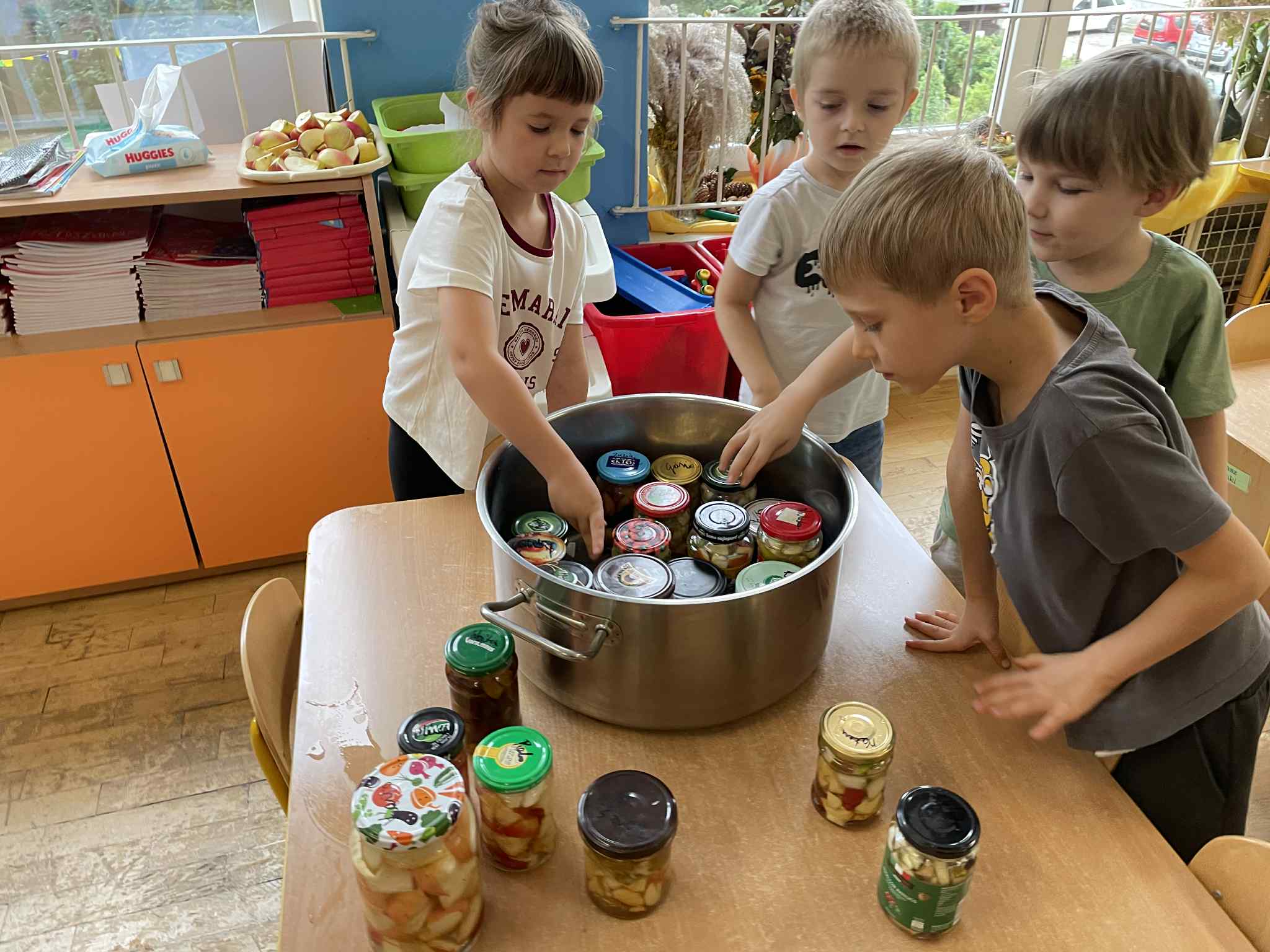 Następnie słoiki zostały zaniesione do kuchni, gdzie dzięki Pani Ani kompoty zostały zapasteryzowane. Własnoręcznie przygotowane przetwory dzieci zabrały do domu, by podzielić się nimi z rodzicami.