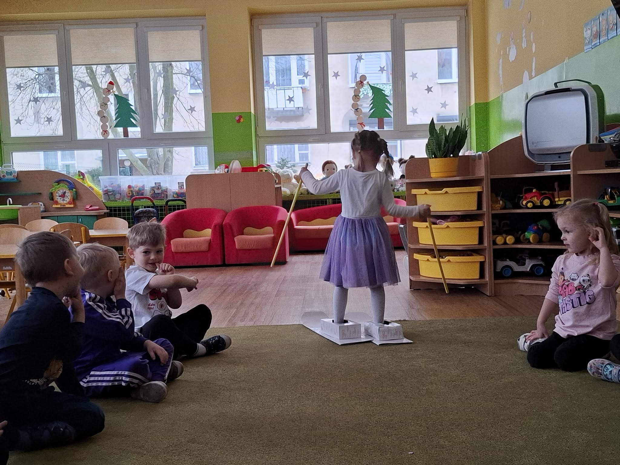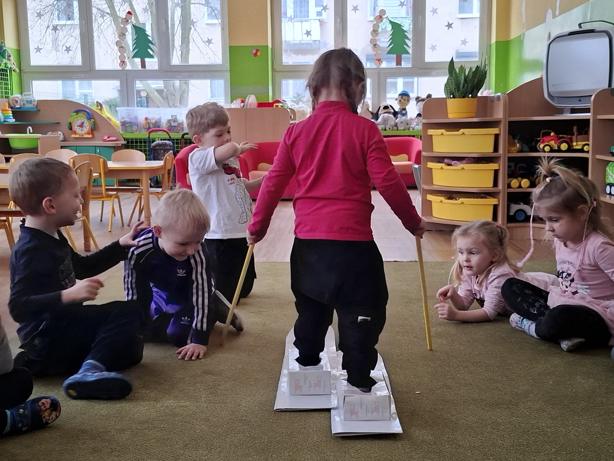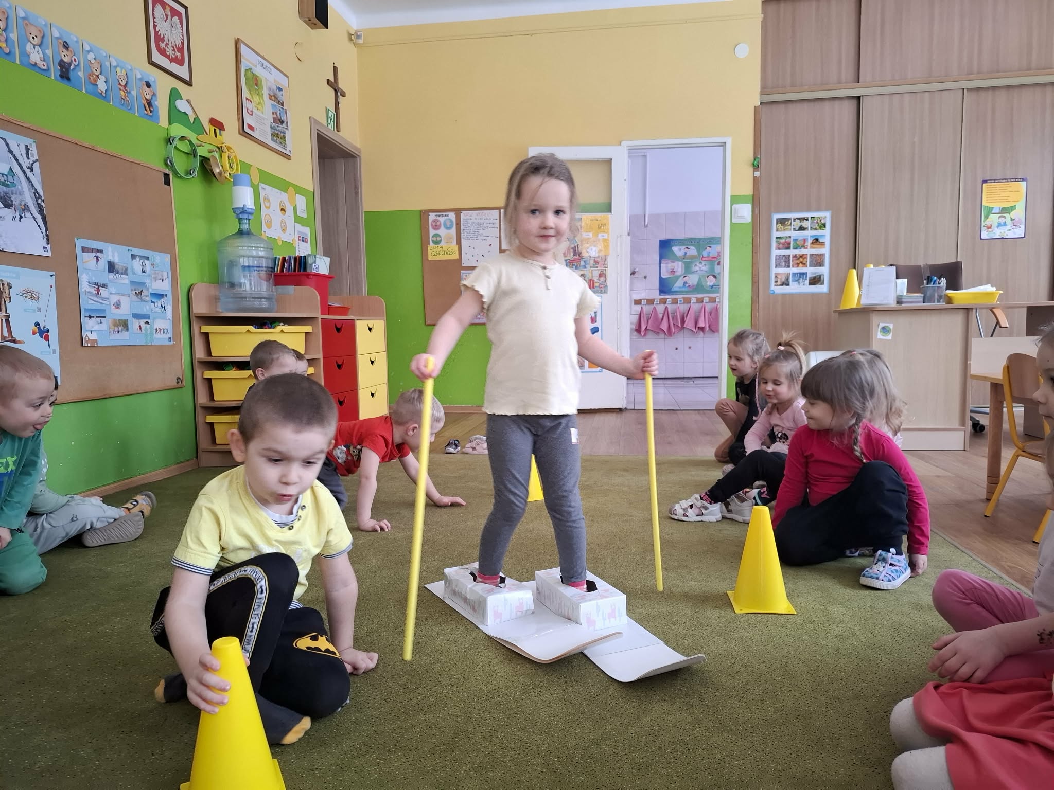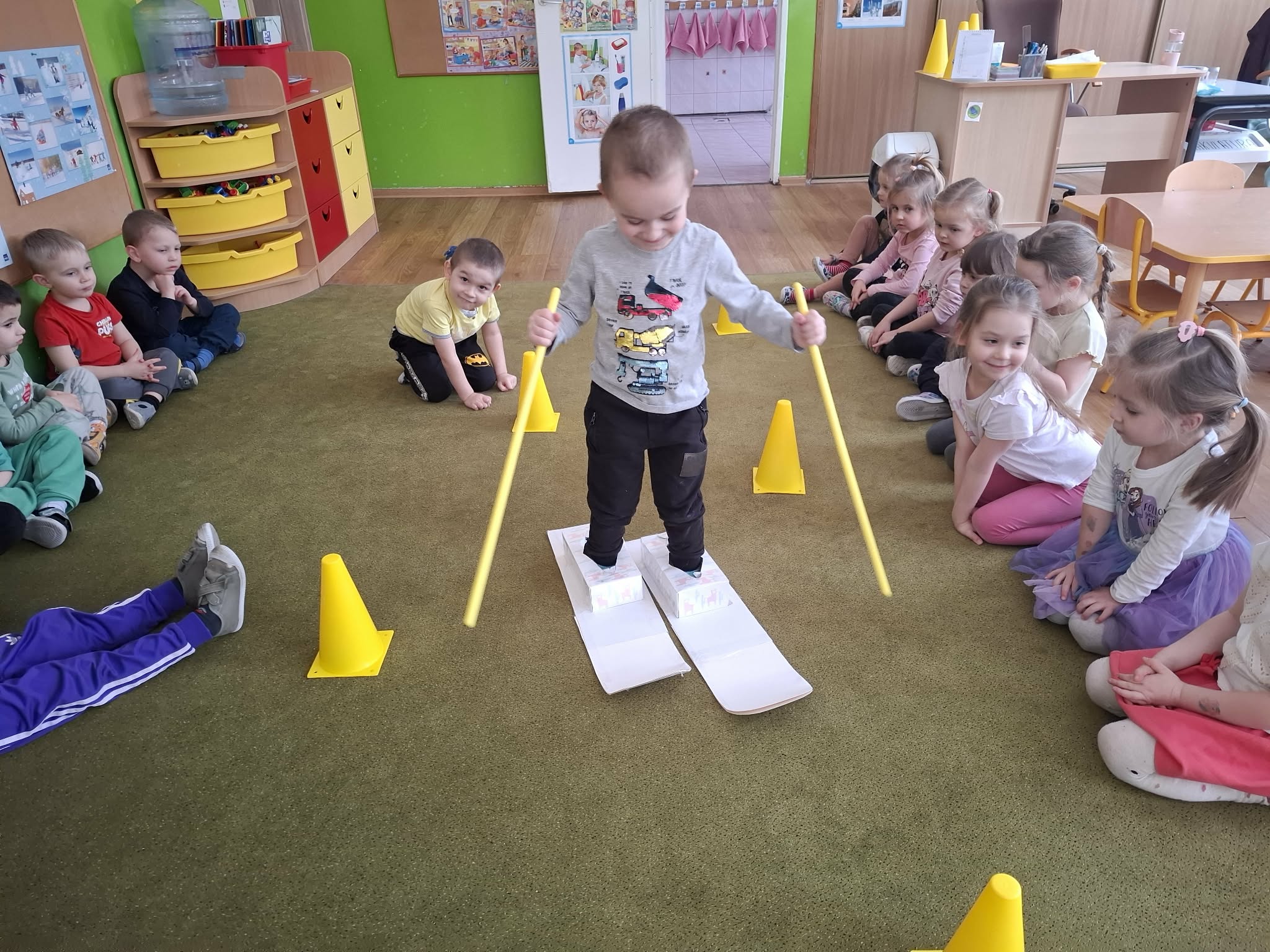 Na piątkowych zajęciach w grupie Motylków dzieci mogły poczuć się jak podczas jazdy na prawdziwych nartach.