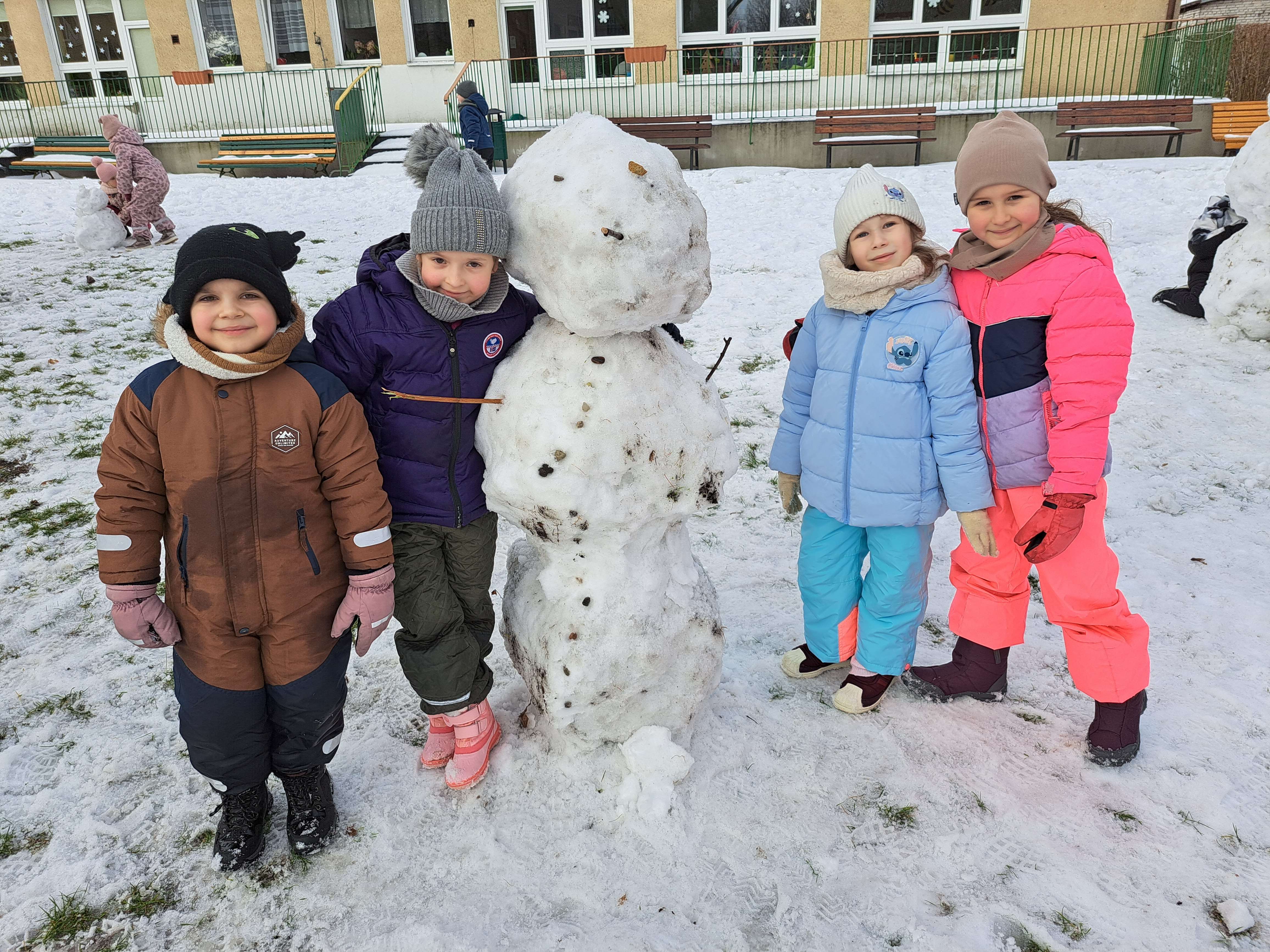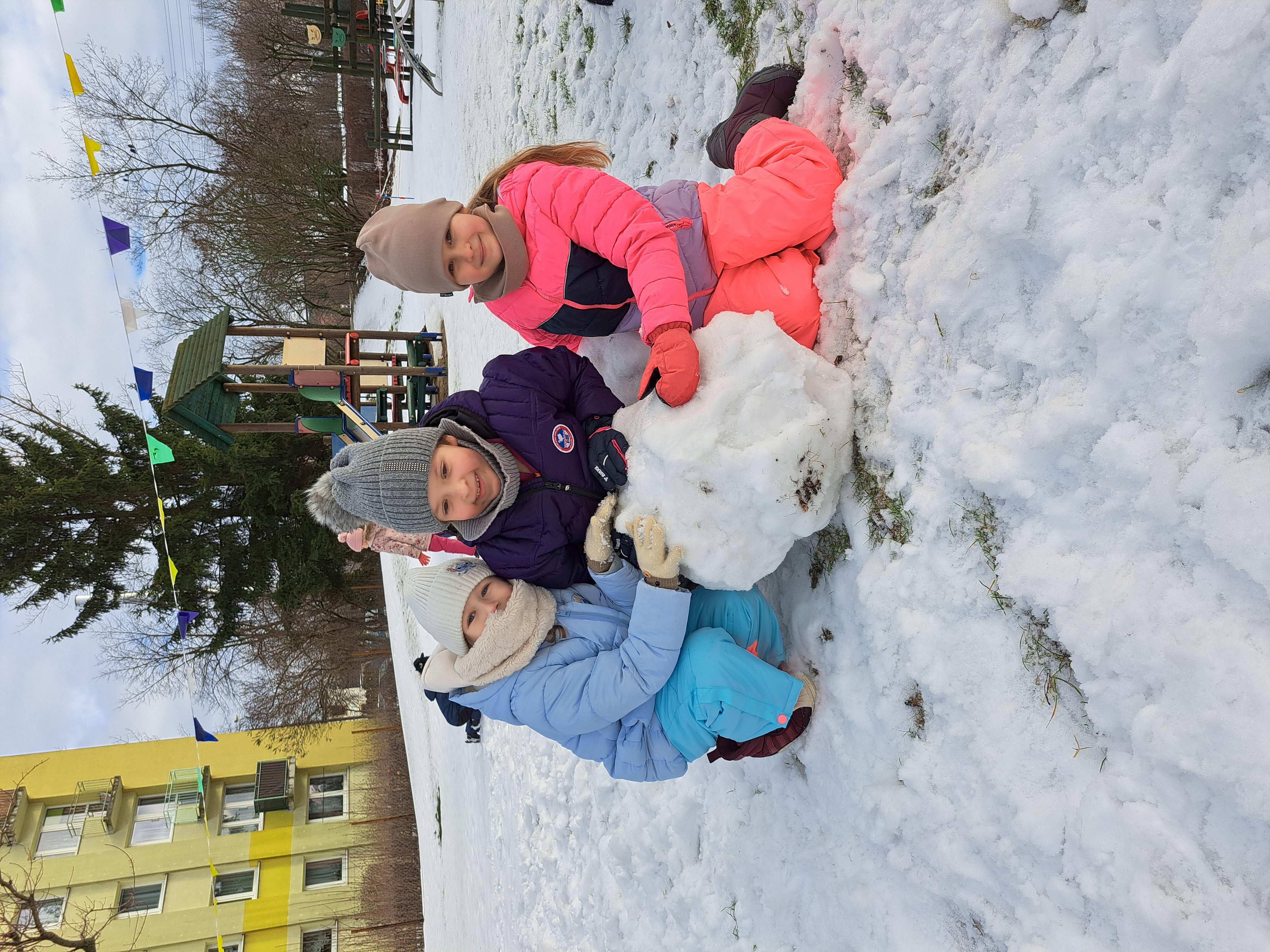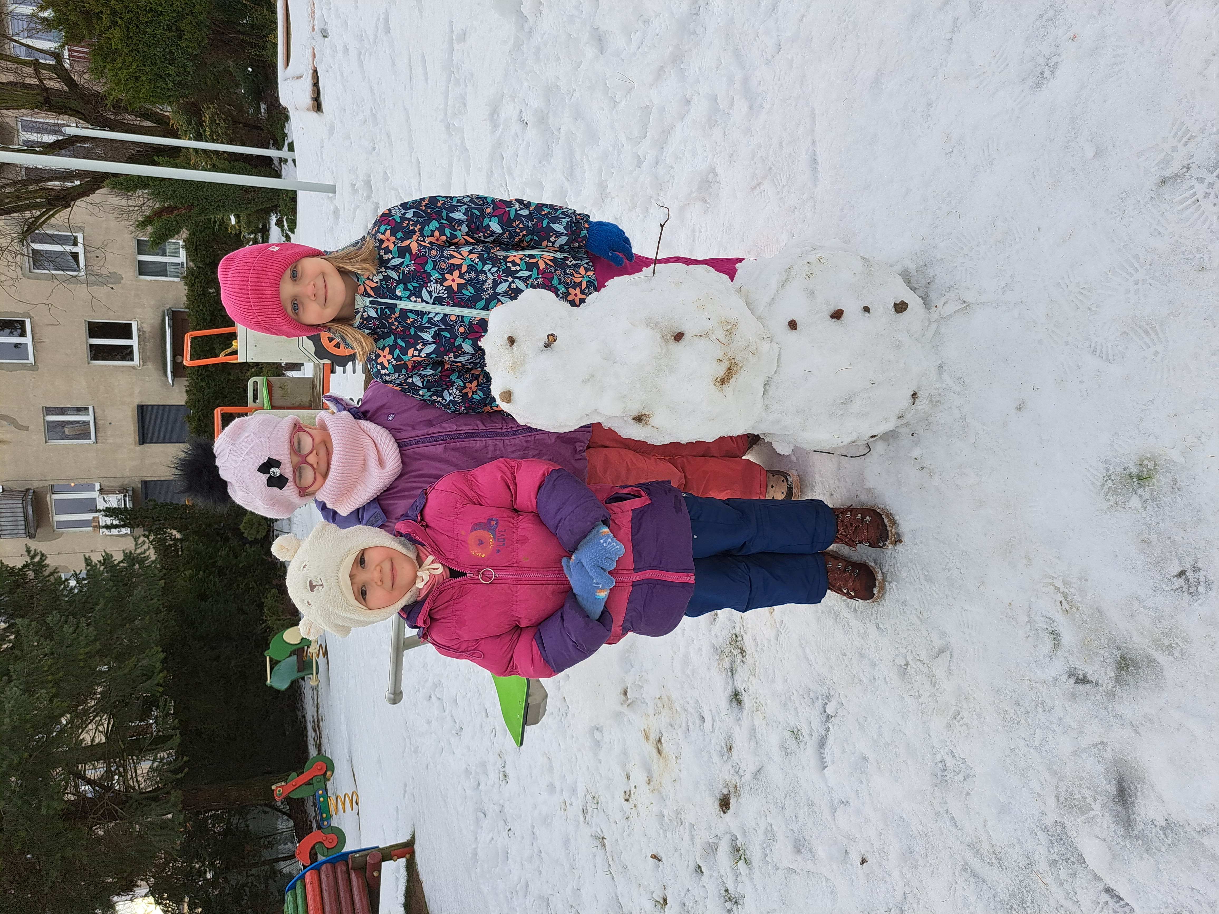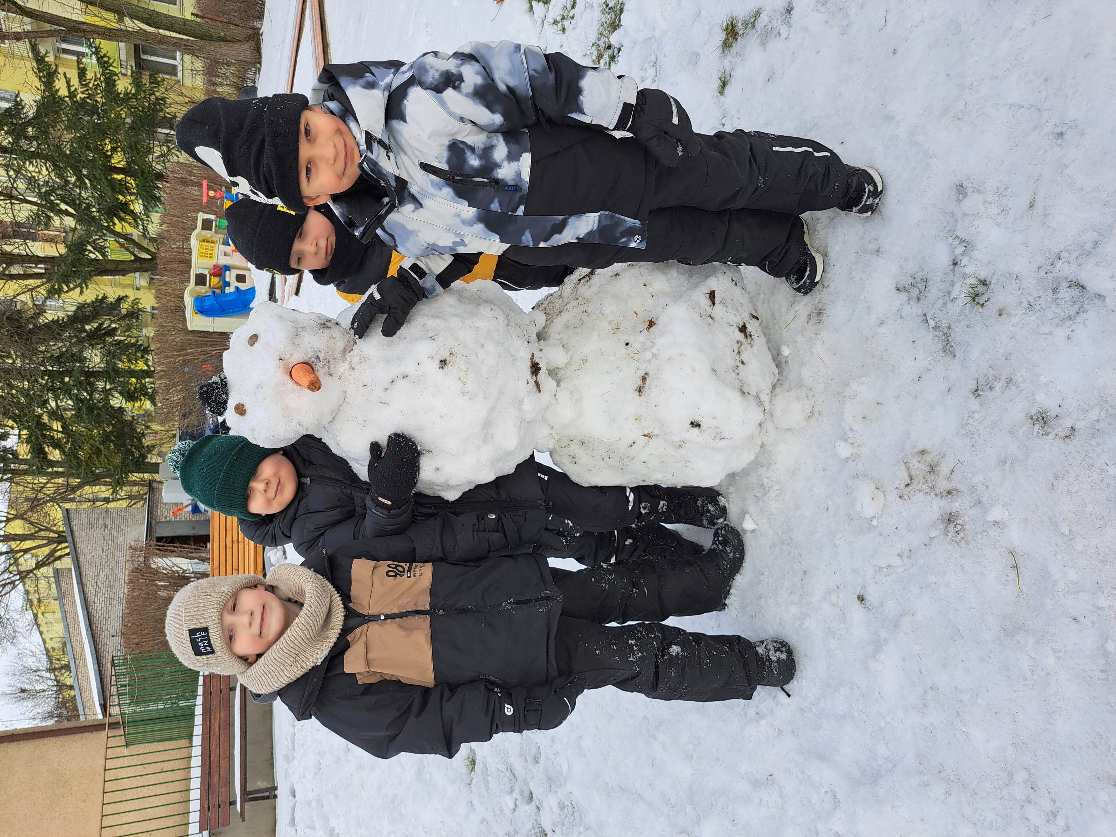 Przedszkolaki z grupy III wybrały się do ogrodu przedszkolnego, gdzie zastały pełno śniegu. Zadaniem dzieci było ulepienie w grupach bałwanków.