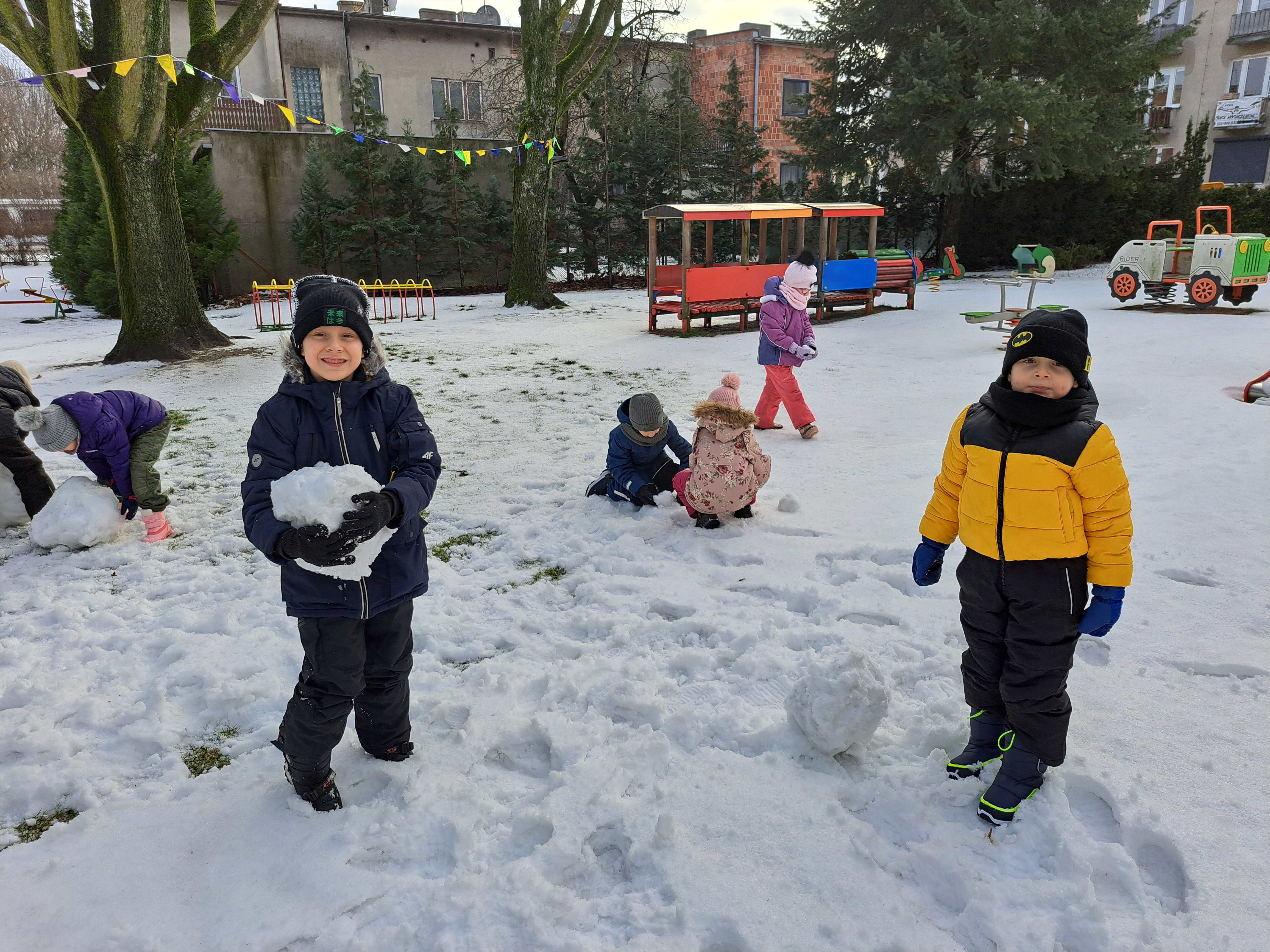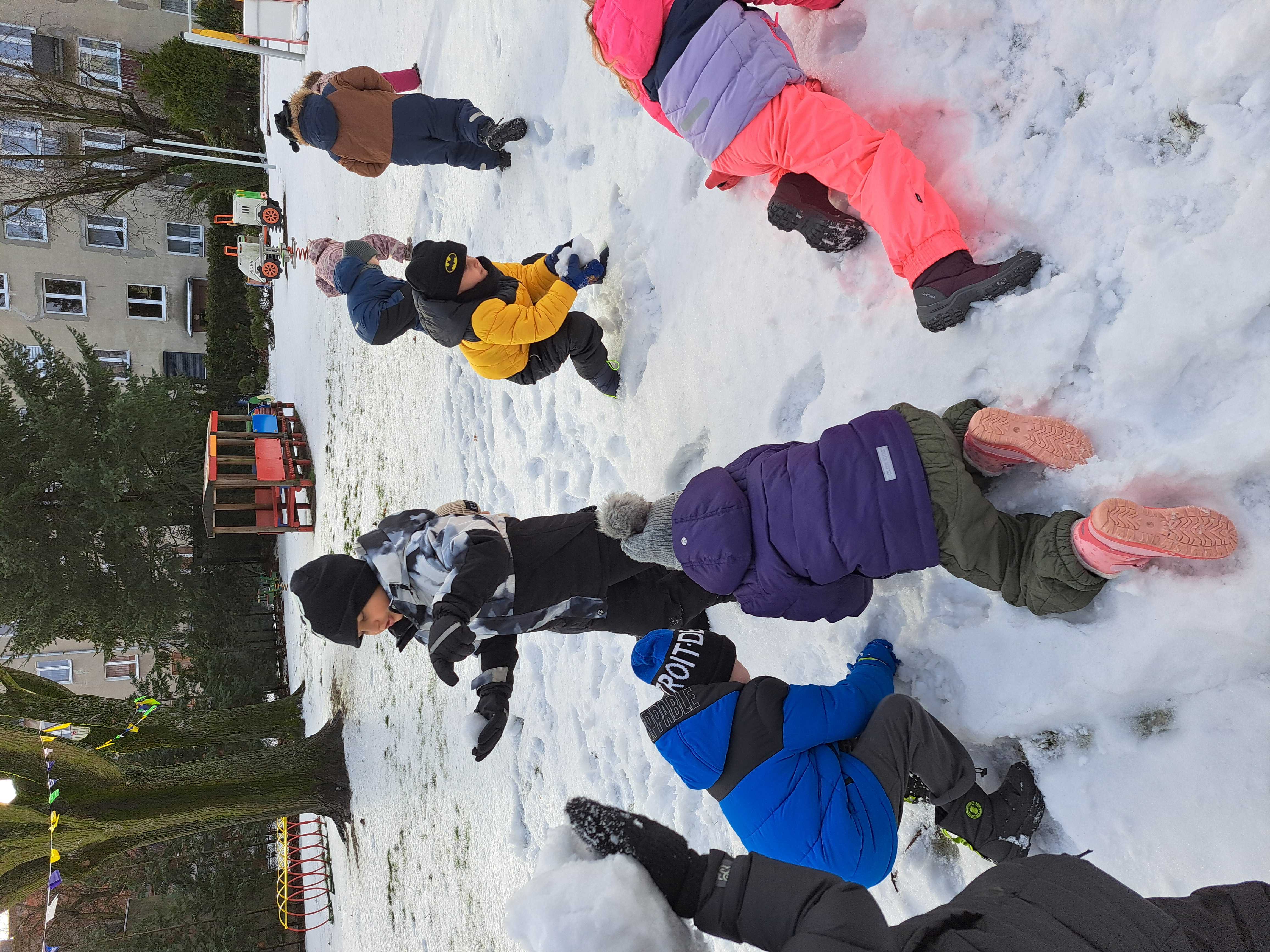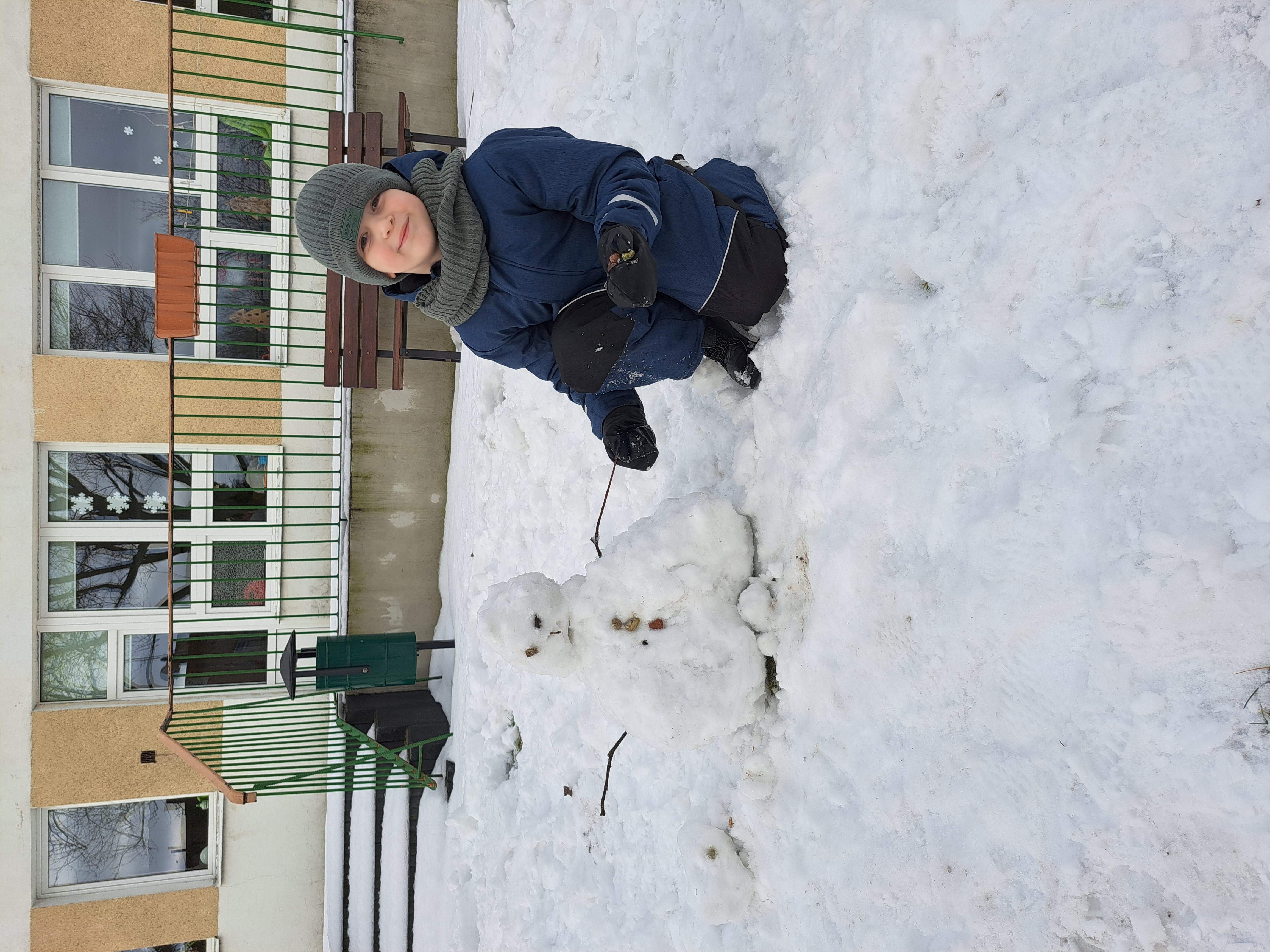 Przedszkolaki z grupy III wybrały się do ogrodu przedszkolnego, gdzie zastały pełno śniegu. Zadaniem dzieci było ulepienie w grupach bałwanków.