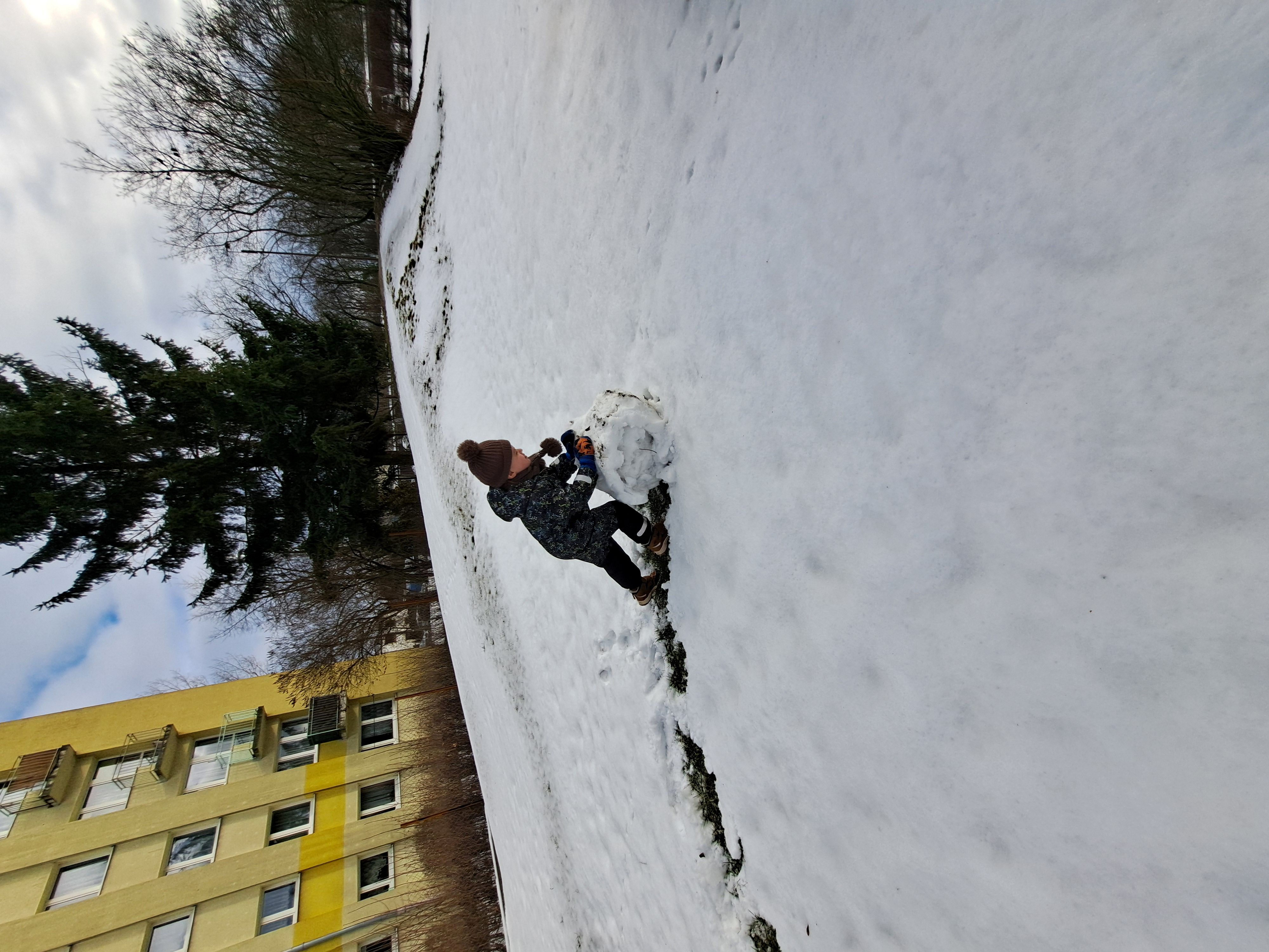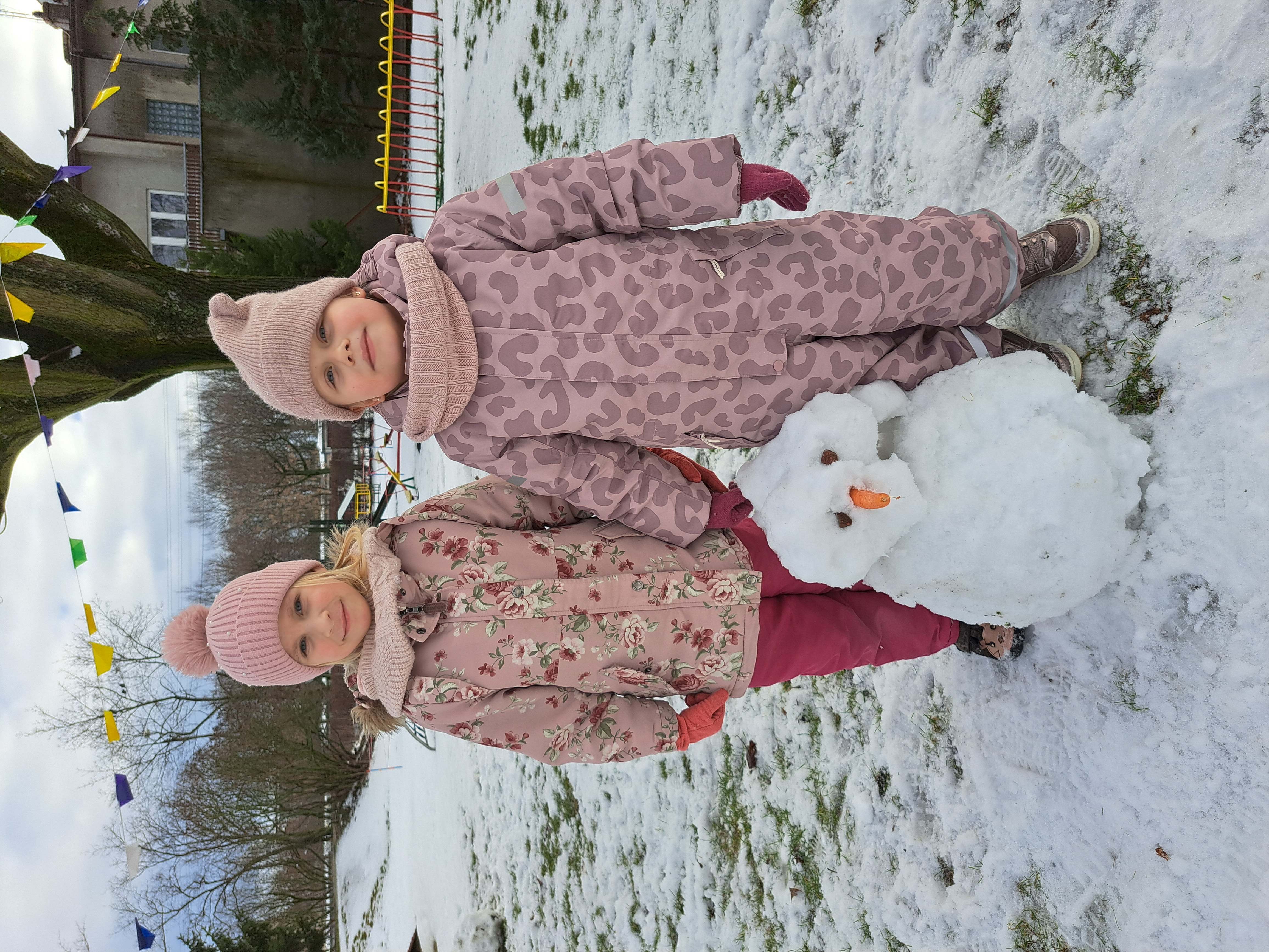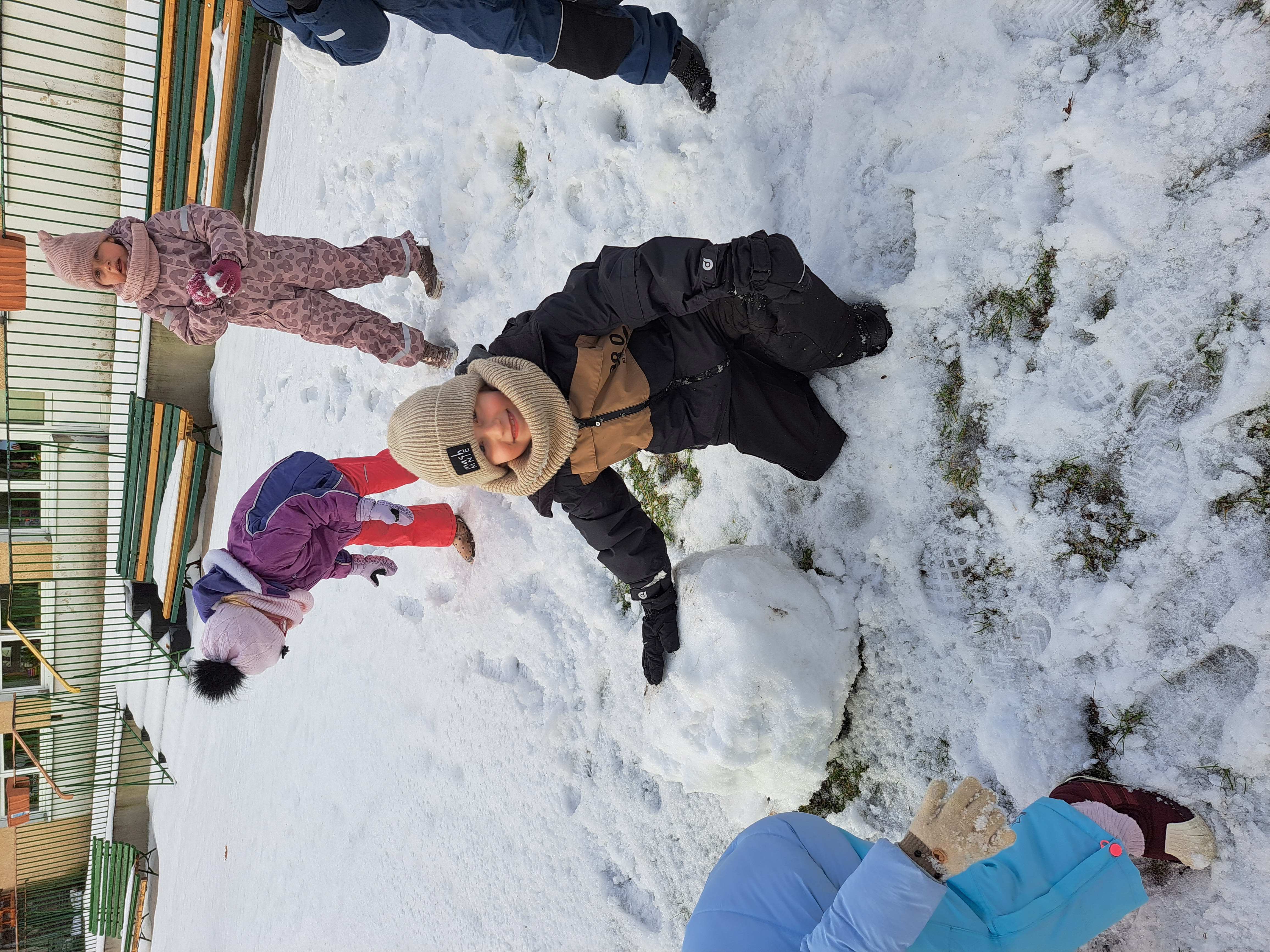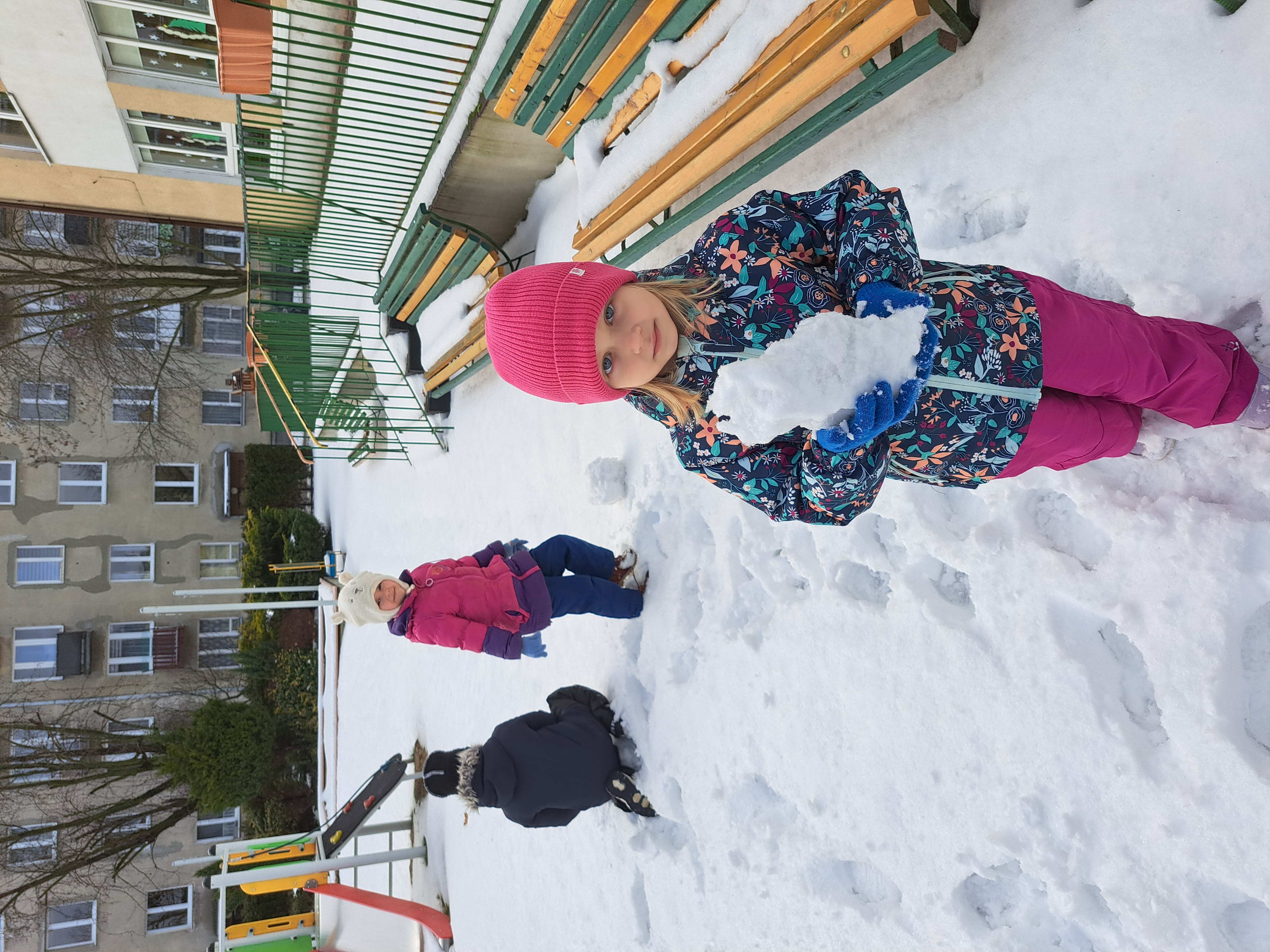 Przedszkolaki z grupy III wybrały się do ogrodu przedszkolnego, gdzie zastały pełno śniegu. Zadaniem dzieci było ulepienie w grupach bałwanków.