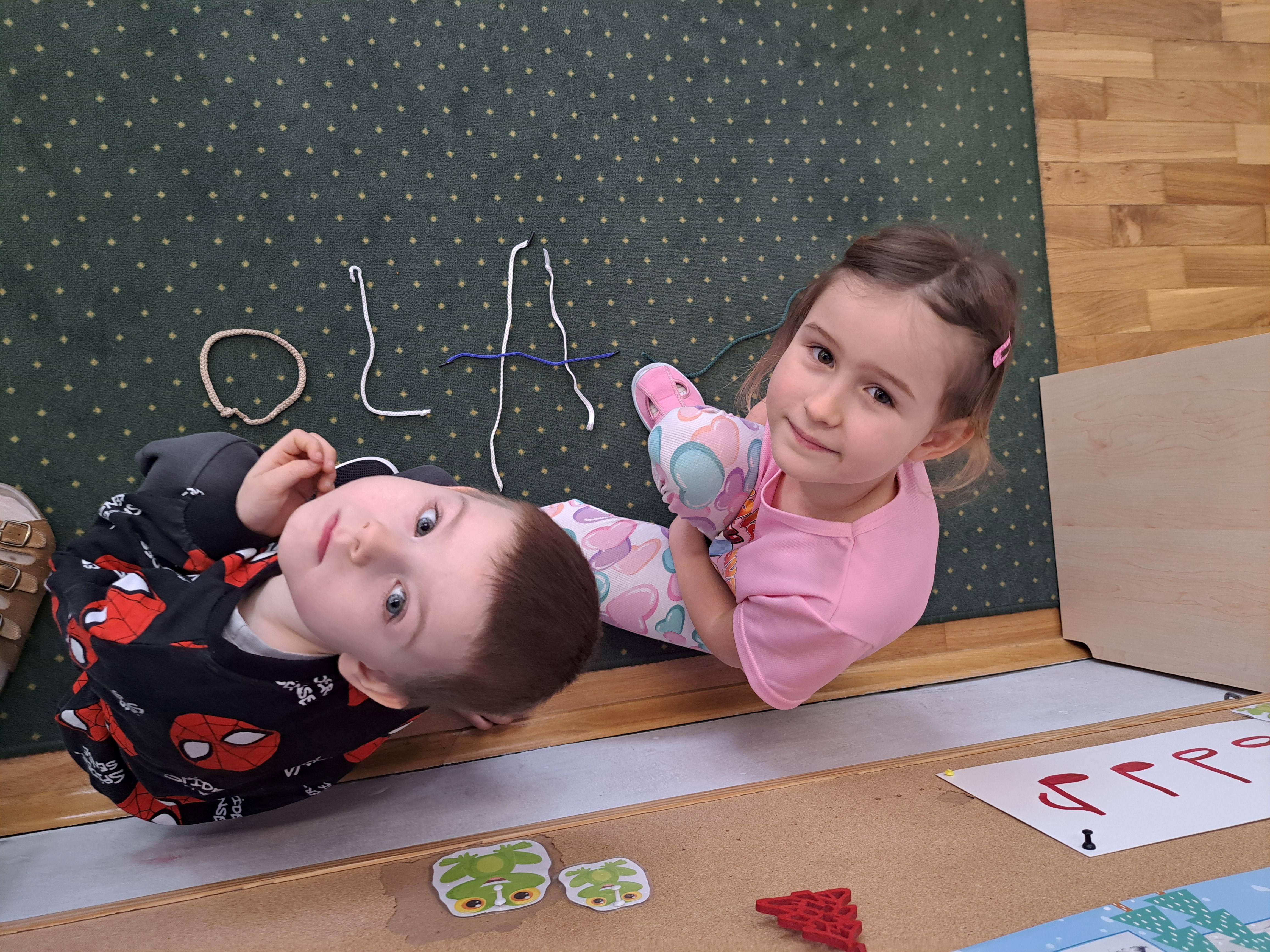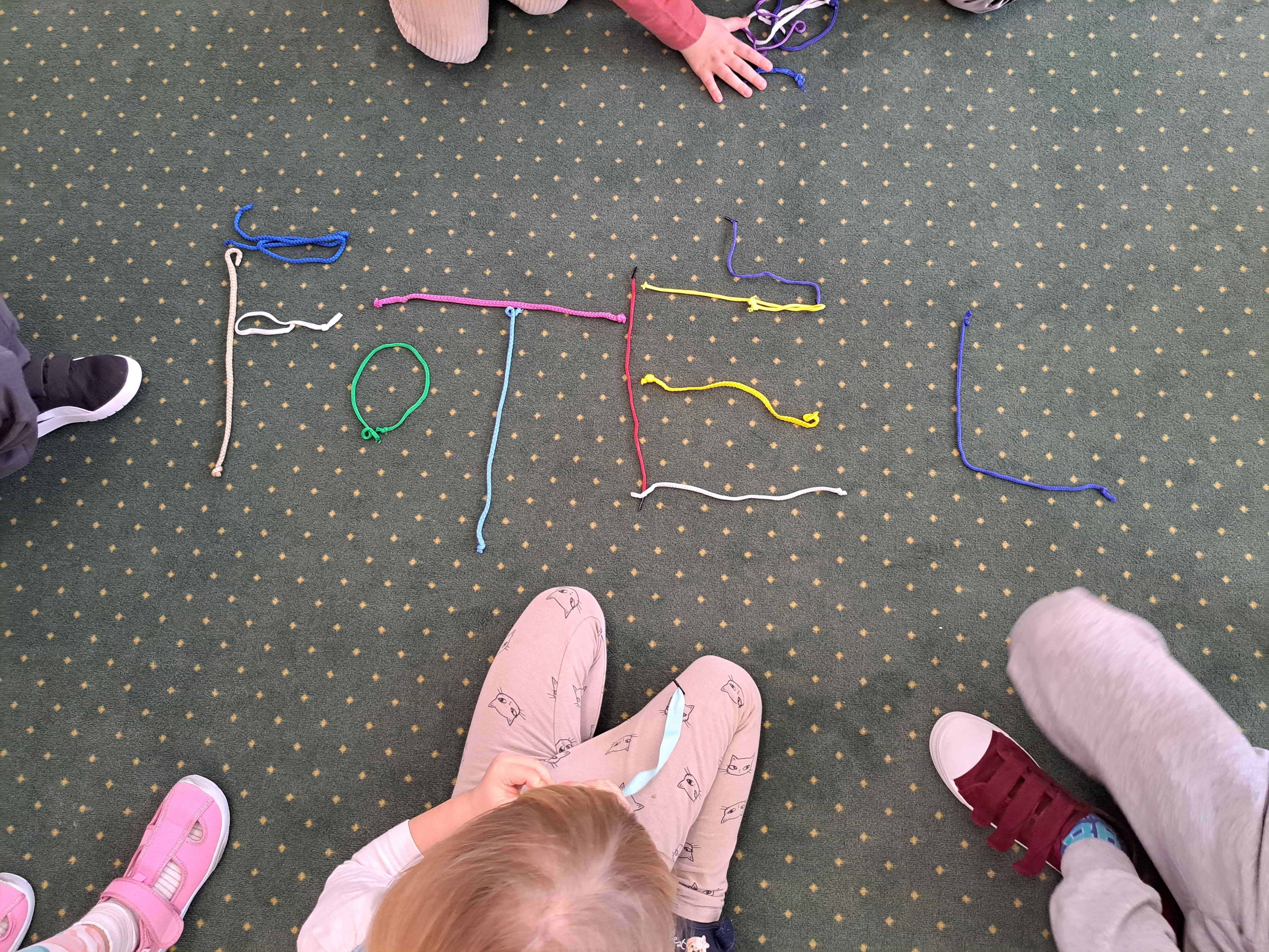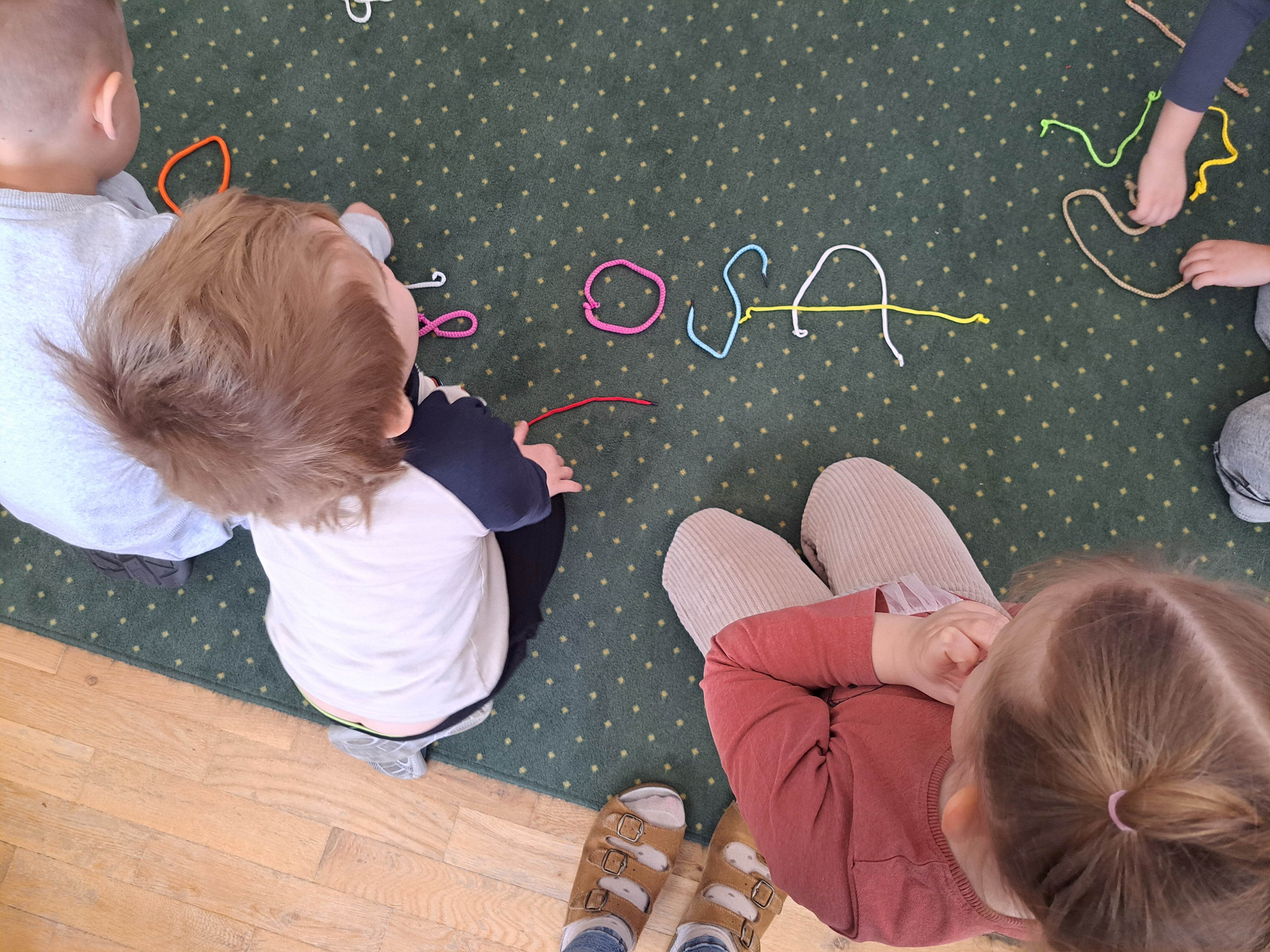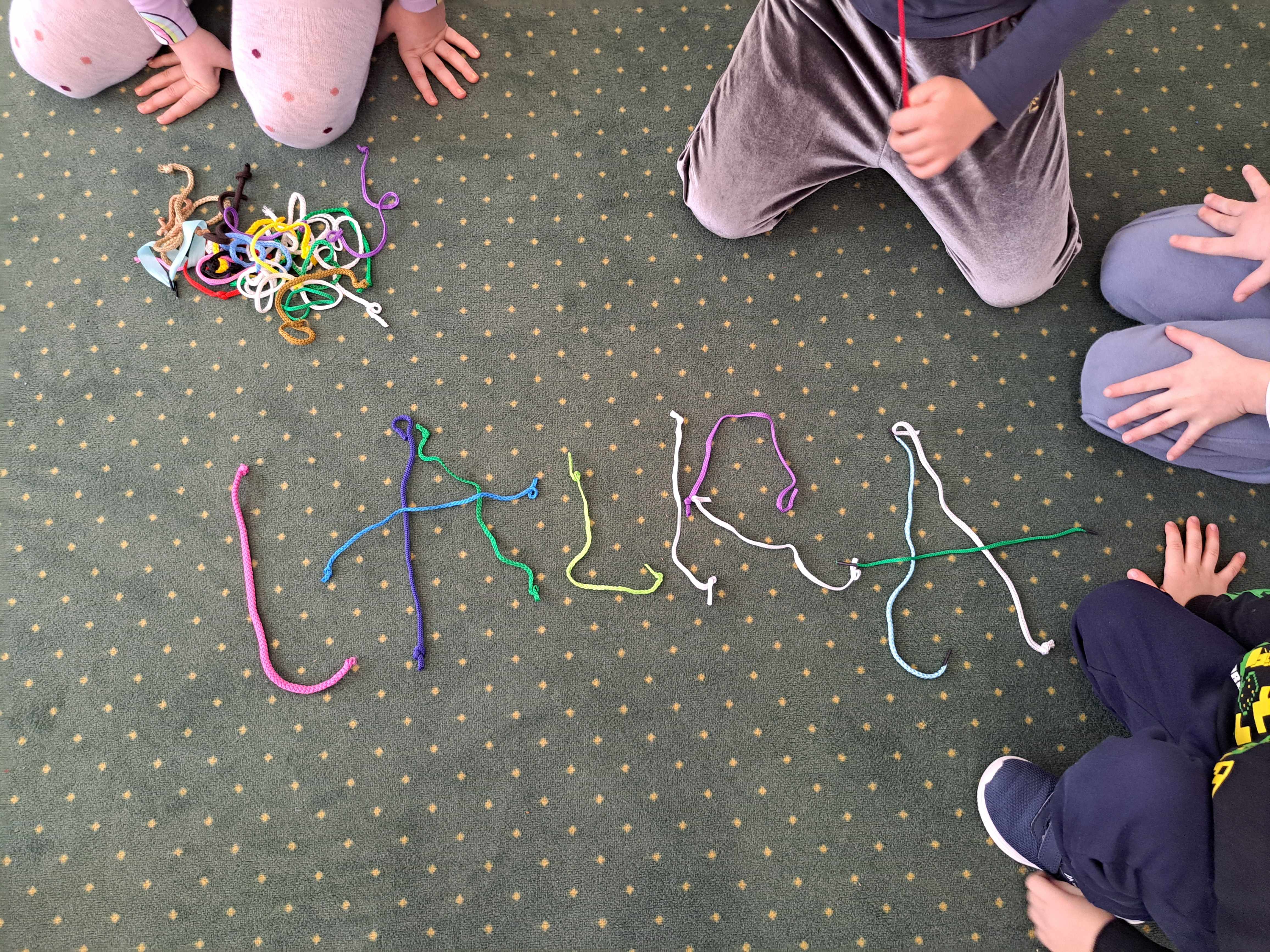 Dzieci miały za zadanie ułożyć ze sznurówek kształty pierwszej litery swojego imienia oraz w grupach układać różne wyrazy. Poszło im świetnie!