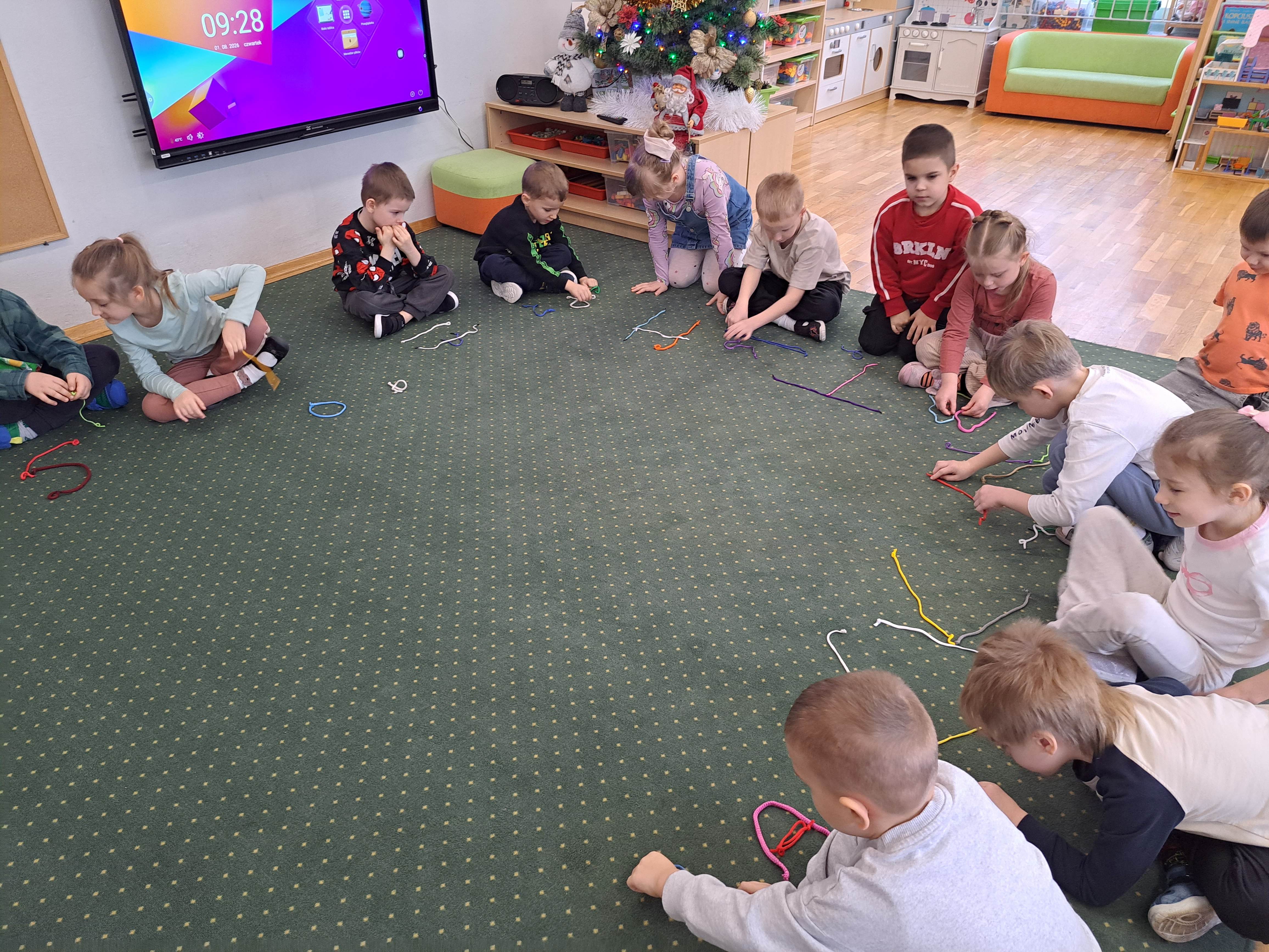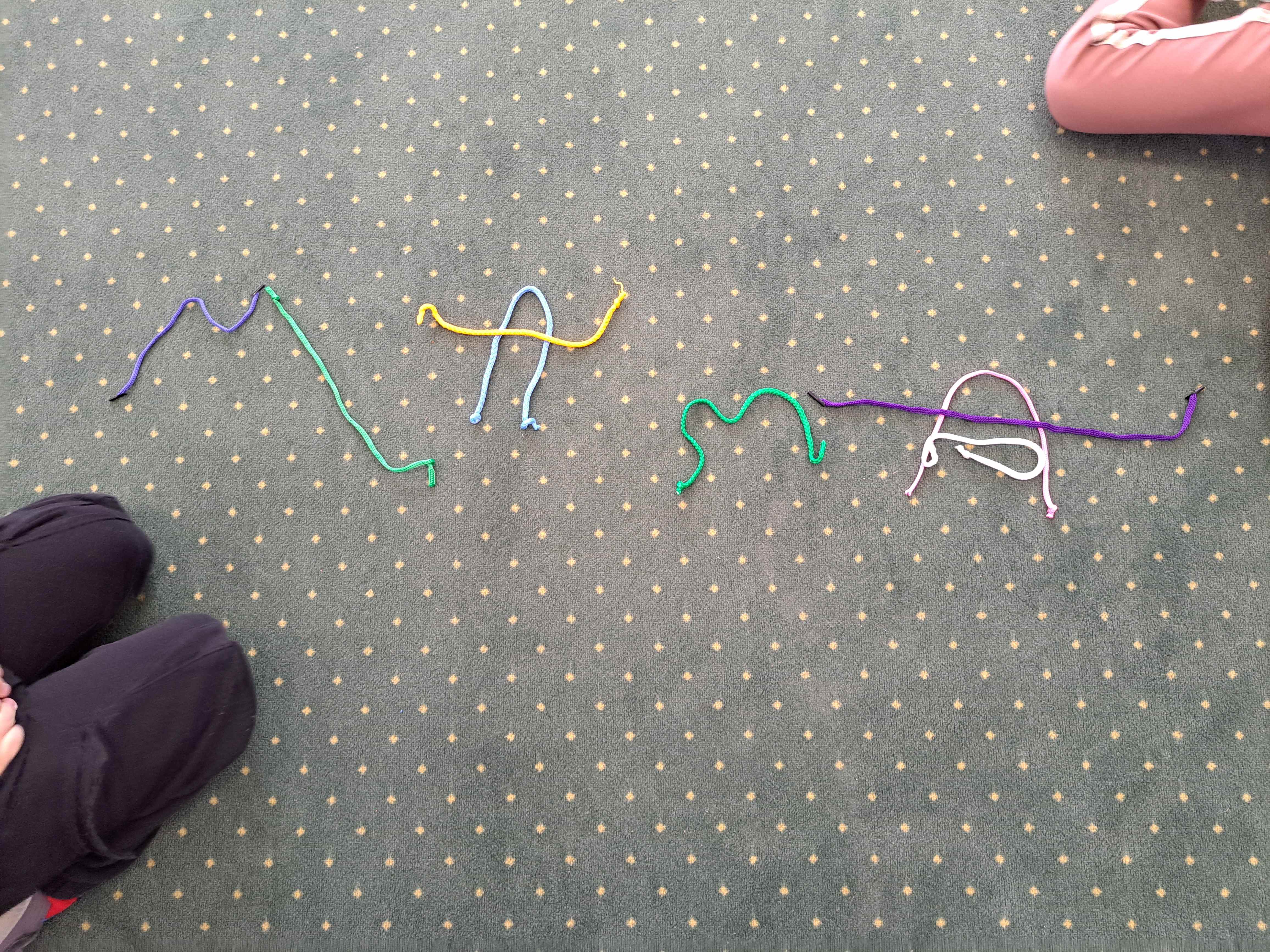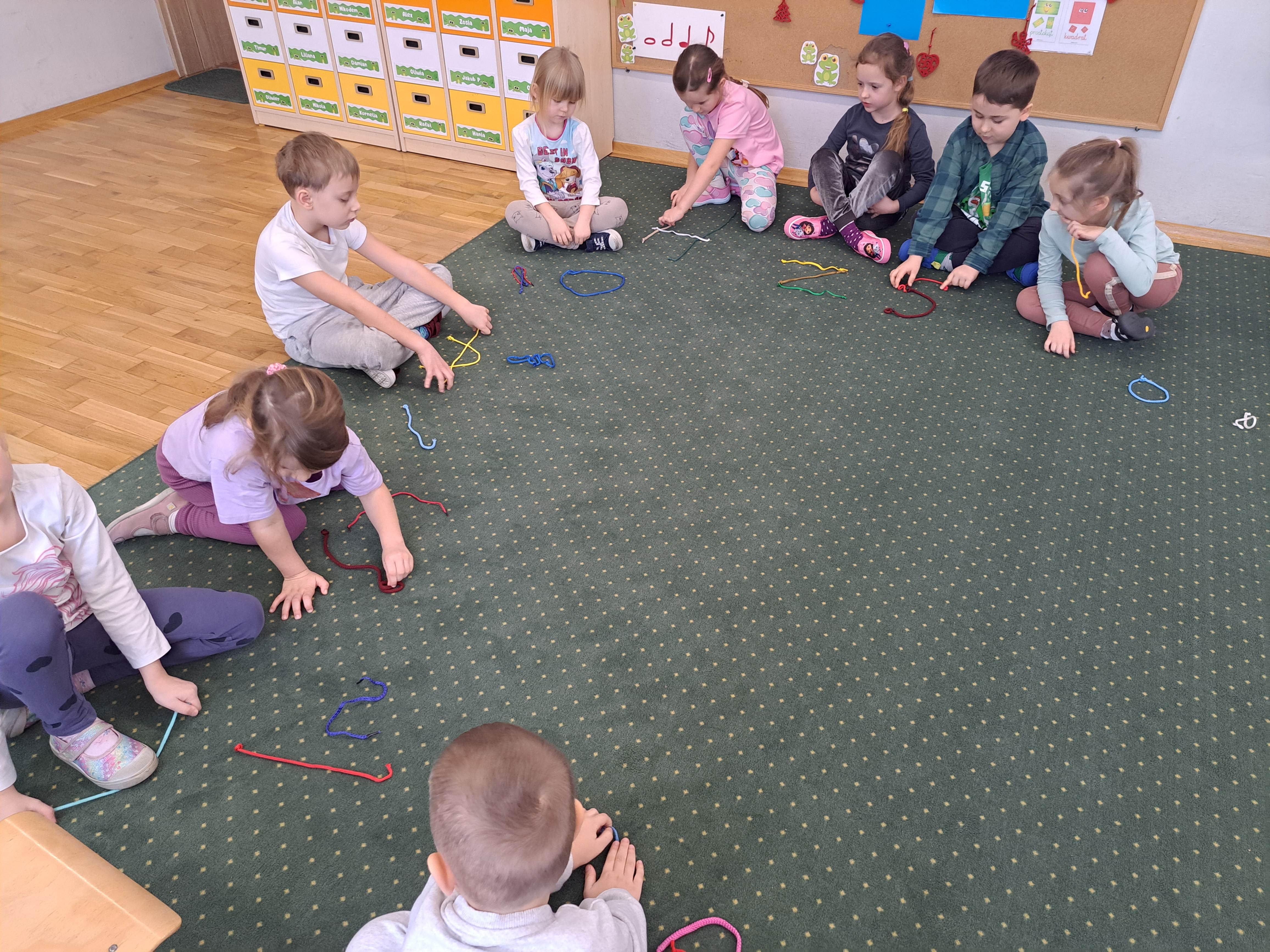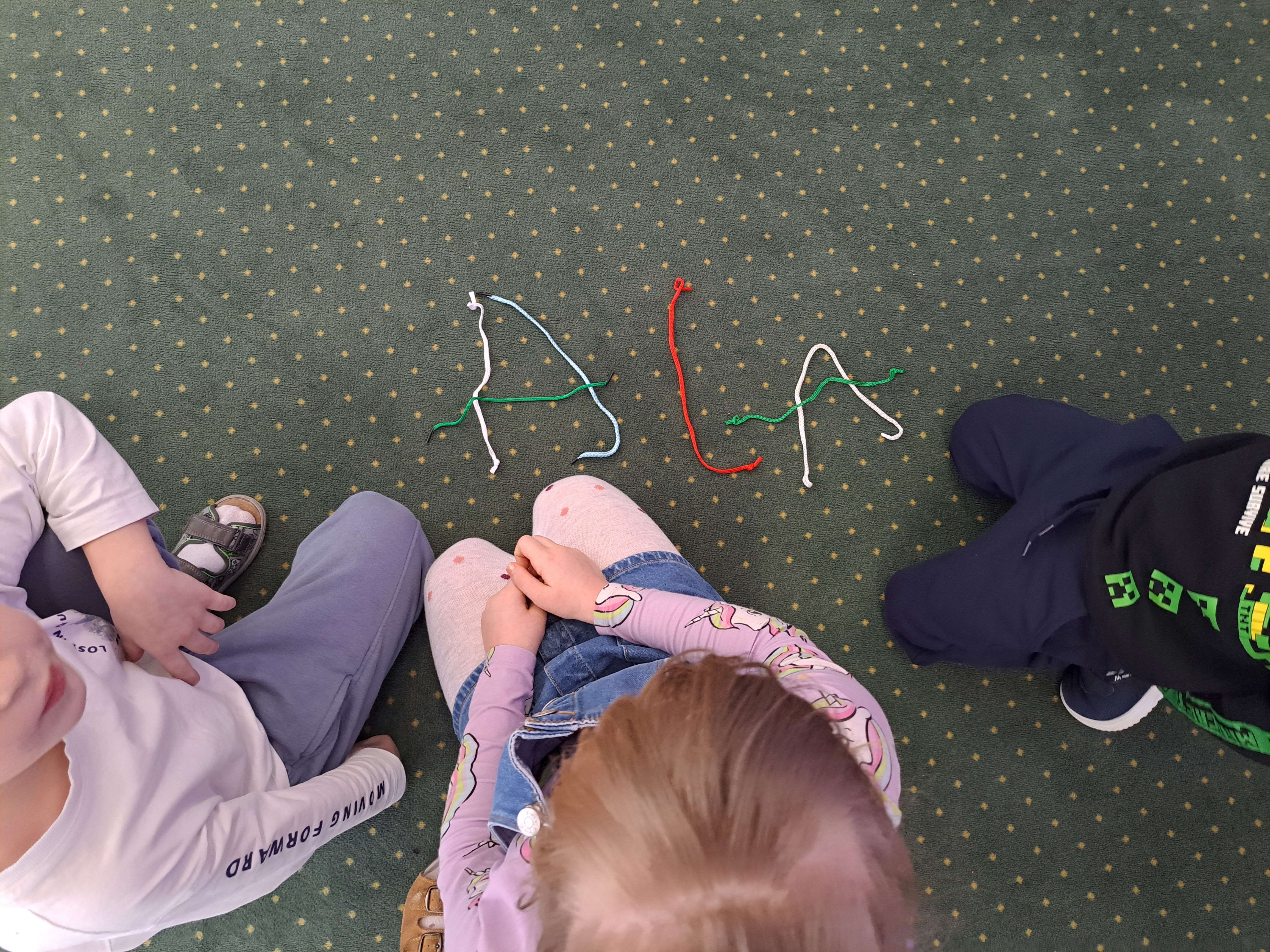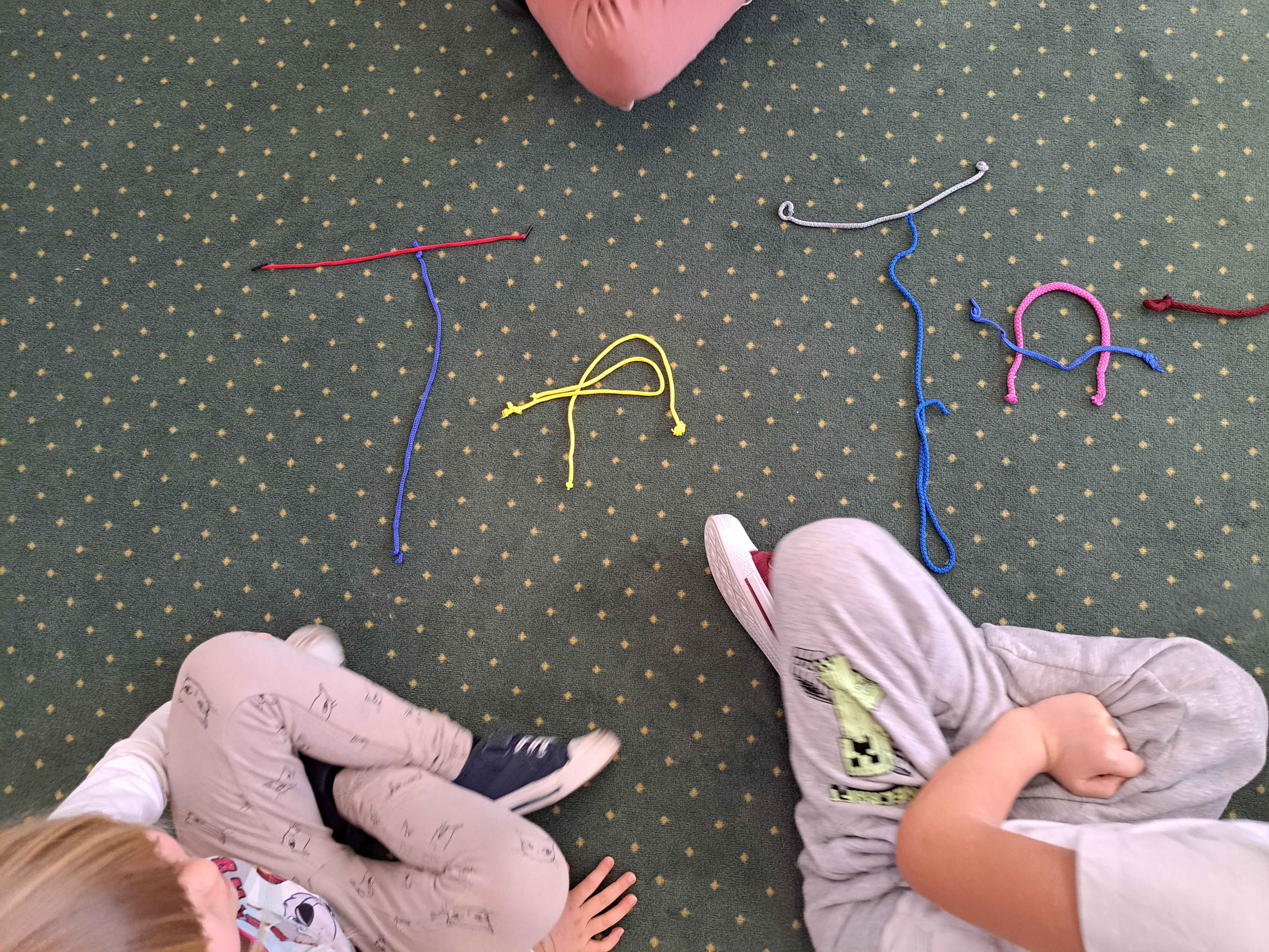 Dzieci miały za zadanie ułożyć ze sznurówek kształty pierwszej litery swojego imienia oraz w grupach układać różne wyrazy. Poszło im świetnie!