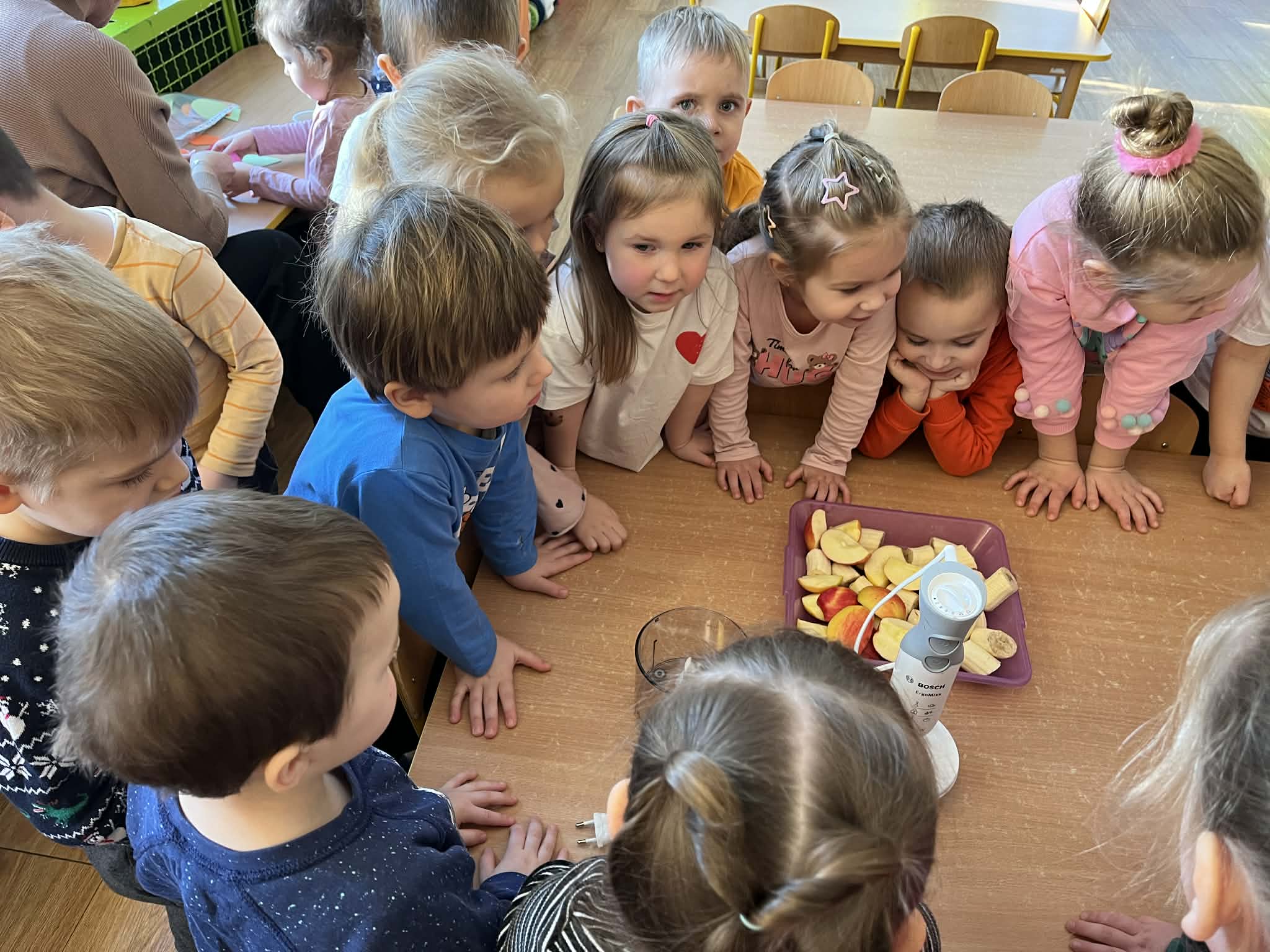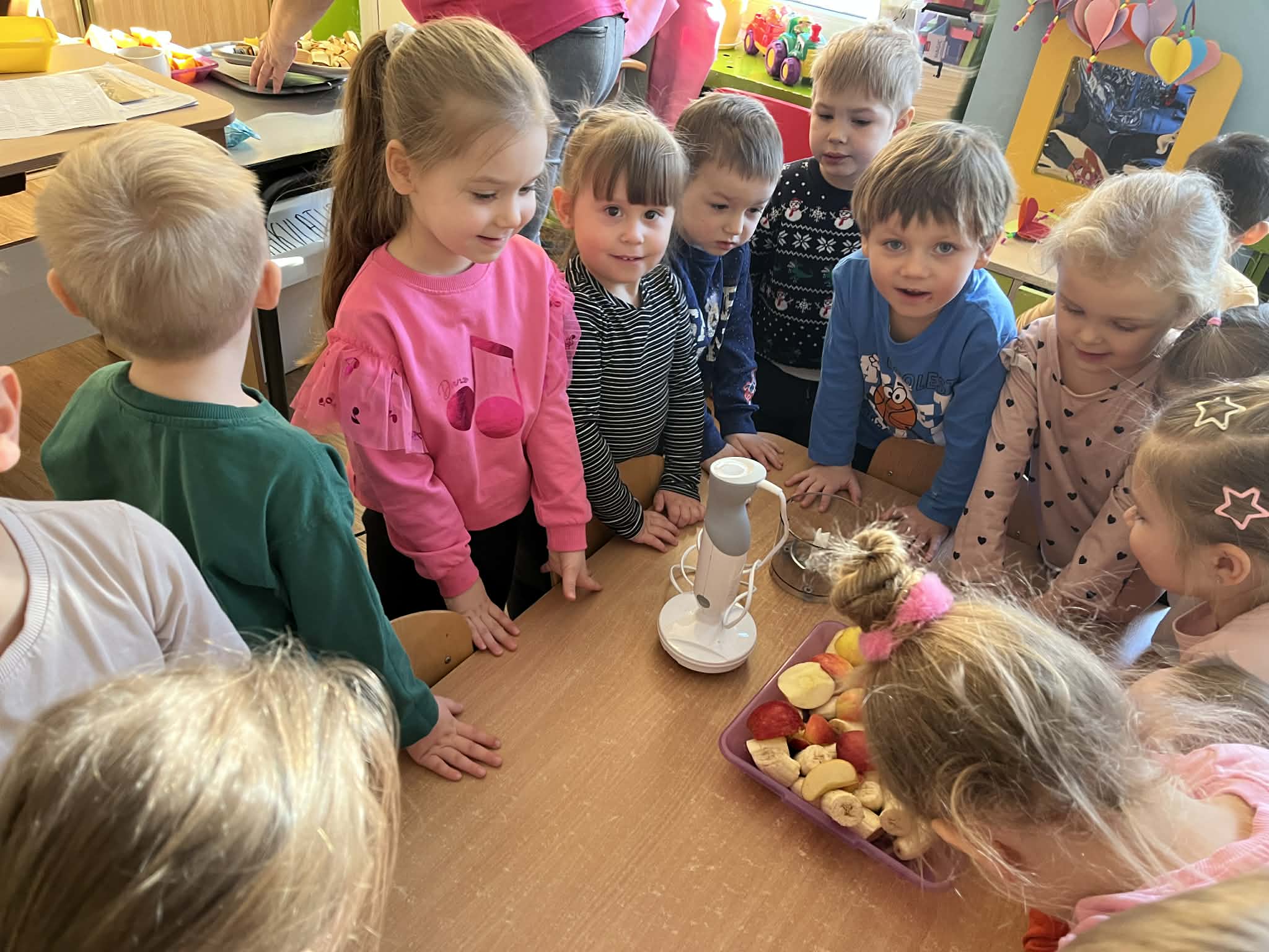 Podczas warsztatów przedszkolaki poznawały różne owoce, ich kolory, zapachy oraz wartości odżywcze. Następnie kroiły owoce i dodawały mleko, a całość była blendowana na gładki, aromatyczny koktajl.