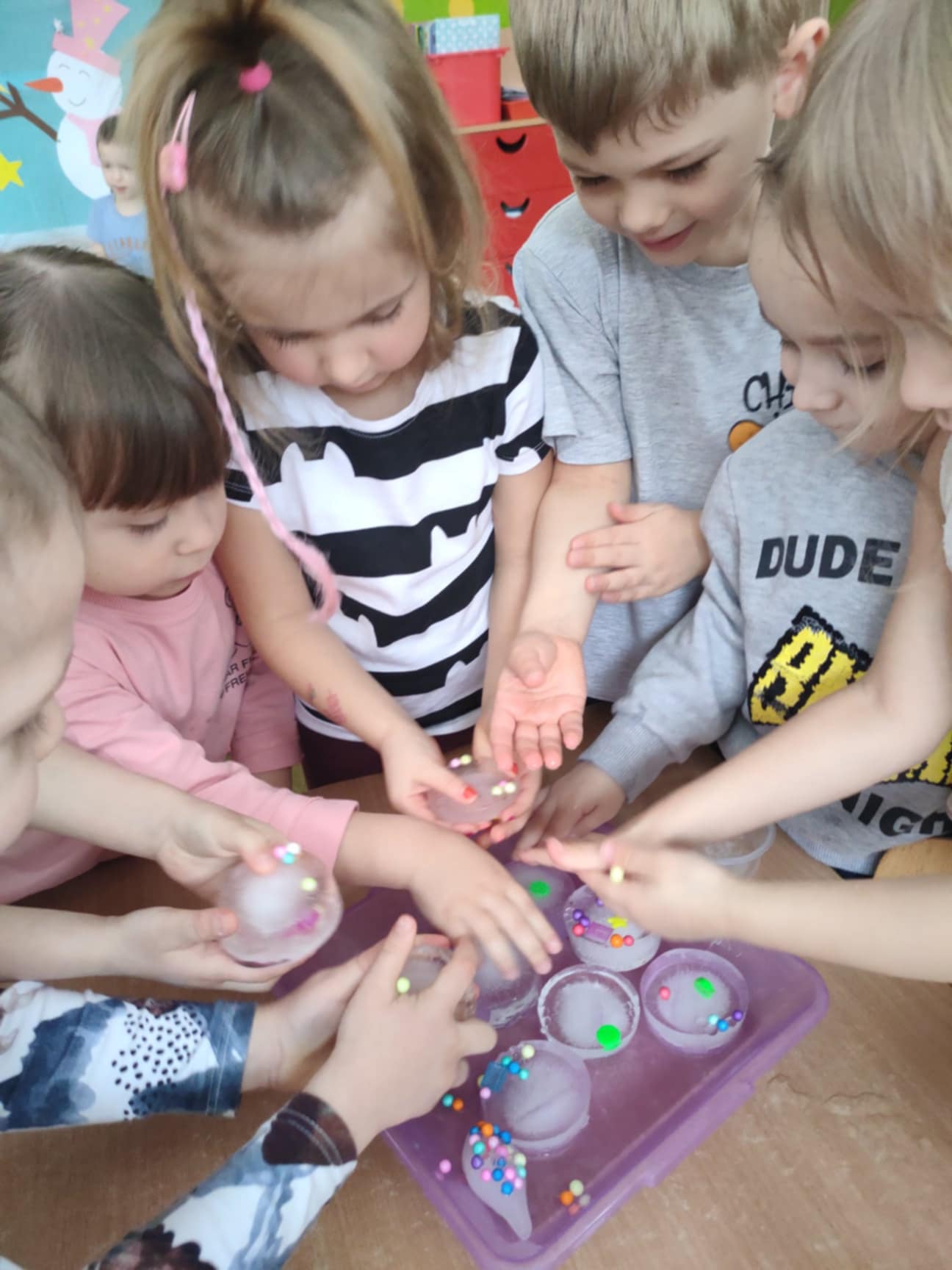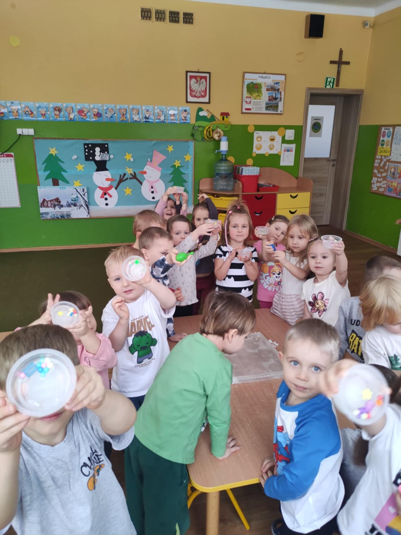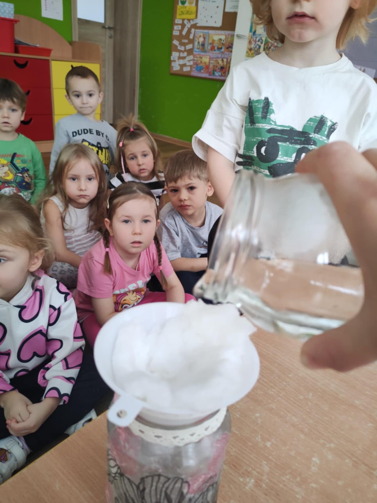 Dzieci z grupy I omawiały właściwości i cechy śniegu. Przedszkolaki sprawdzały czy śnieg jest czysty, przeprowadziły doświadczenie co się stanie z wodą pozostawioną na mrozie.